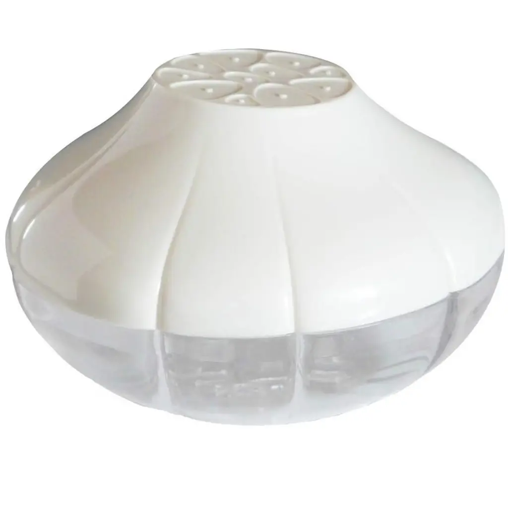 Recognizing that the best way to store garlic is to keep it in a well-ventilated container, Hutzler took its cues from nature and created a garlic-shaped storage solution with a clear bottom and opaque top.The holes at the bottom allow for air circulation around the garlic. It will keep your garlic fresher longer, usually an additional 30 -45 days. A twist lock attaches the 2 sides of the Garlic Saver.Each is phthalate and BPA-free. Reusable and recyclable. Dishwasher safe. Stores 1 head of garlic. Measures 4.3" in diameter and 2.7" tall.