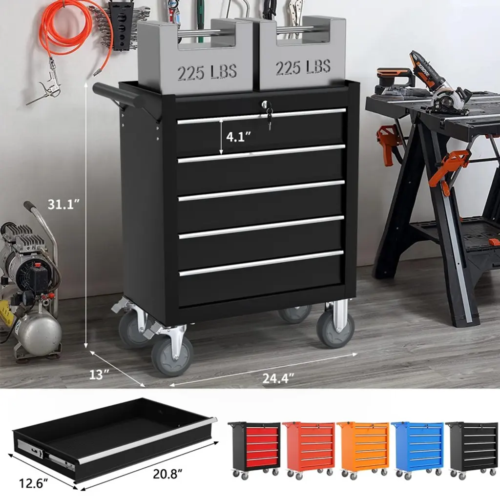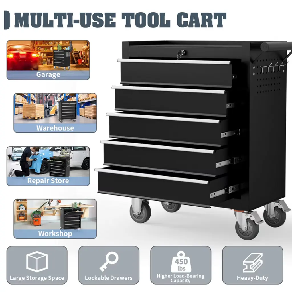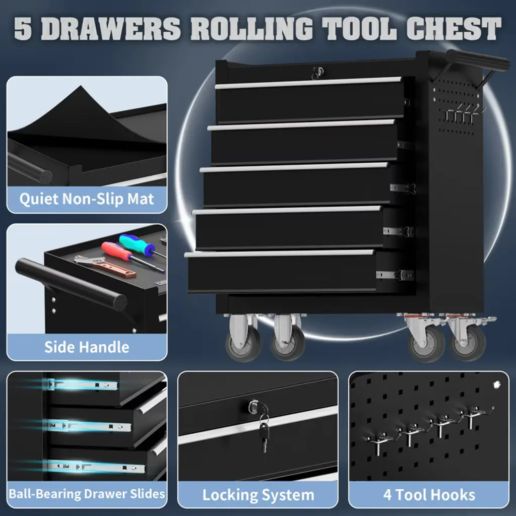 Huxxion 5-drawer Heavy Duty Rolling Tool Chest Tool Storage Box-black