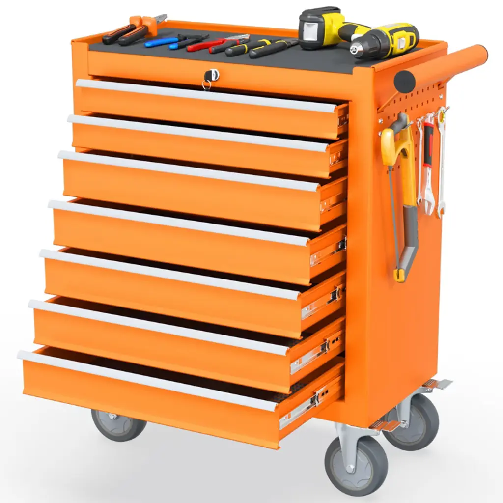 [Durable Material]Our rolling tool chest is made of thickened cold-rolled steel sheet, which is thicker and better than ordinary steel. Three layers of powder coating are applied to the surface of the steel sheet, which improves the surface color of the toolboxes and increases their durability. This material is extremely strong and durable and is ideal for use in a variety of indoor and outdoor applications. [Large Capacity]Equipped with a top work surface and 5 removable drawers, this tool box provides you with ample storage space to keep your tools and accessories organized. [Slides and Lockable]Each drawer is equipped with ball bearing slides, which makes the drawers operate smoothly and won't slam shut. It also comes with a key and lock to ensure your tool chest has a locking mechanism to protect your items. [Easy Mobility]The rolling tool box's 4 universal casters (2 of them with braking function) allow you to move and place the toolbox easily, bringing great convenience. [Widely Used]Our rolling tool box comes with detailed assembly instructions to make the assembly process easy, and has plenty of storage space to meet your needs in different occasions. Whether it is a garage, warehouse, workshop or repair shop, it can provide great convenience for your work.