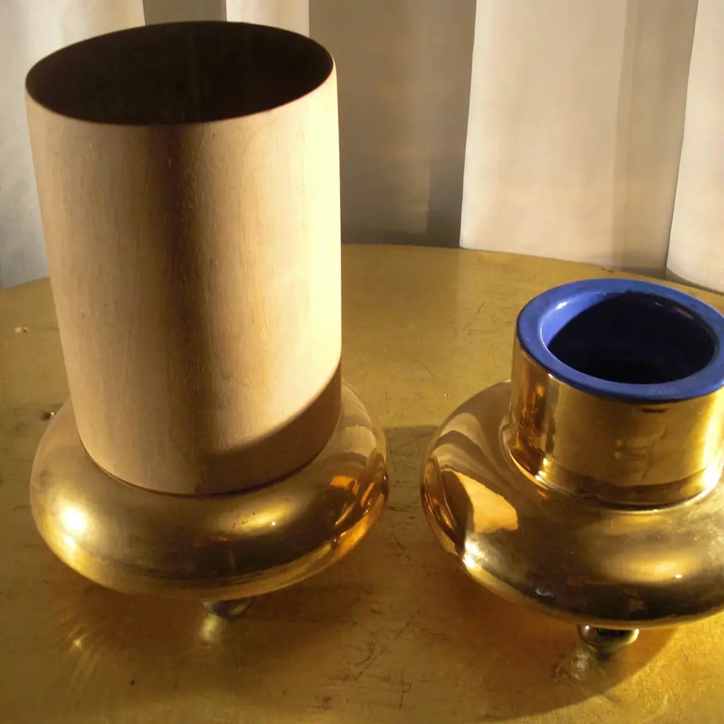 A precious gem of inclusive craftsmanship, this superb piece can equally serve as a cylindrical box or as a purely decorative piece when disassembled to form two separate vases. It belongs to a series from 2001 of unique pieces blending hand-turned wood with flattened ceramic domes finished in gold through the third firing step. The wooden body can host dry flowers, while the majolica one - glazed in blue on the interior and functioning as a lid for the former - can keep wildflowers fresh.