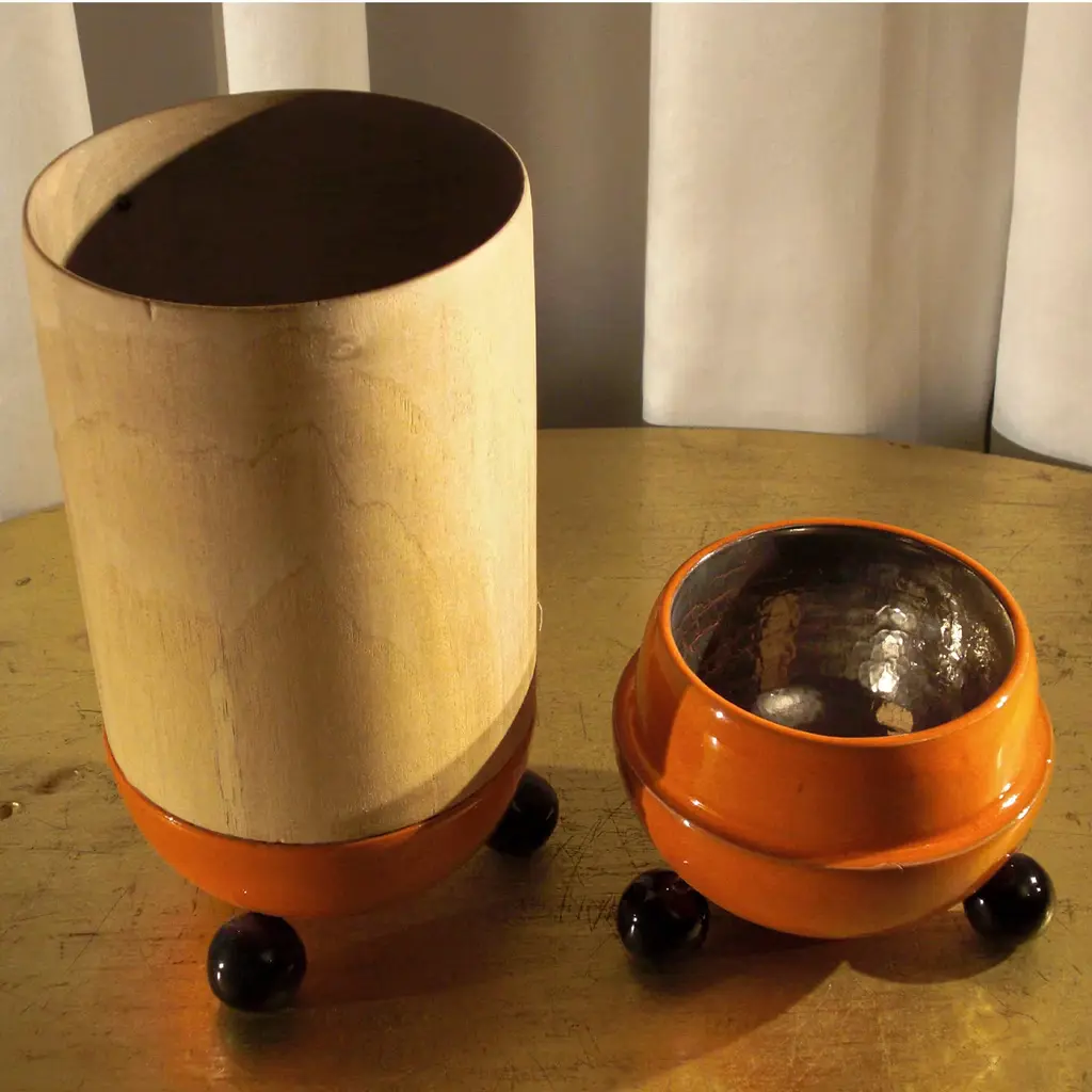 A charming hybrid between a modern sculpture and a multi-functional item, this one-off box consists of interlocking volumes handcrafted of wood turned by hand and of prized majolica from Faenza. The natural-finished wooden shape is complemented by domed majolica elements glazed in glossy orange with spherical feet glazed in black. Once the lid is pulled out, it can serve as a tiny, footed vase, also revealing its inner finish of shimmering gold obtained through the third ceramic firing step.