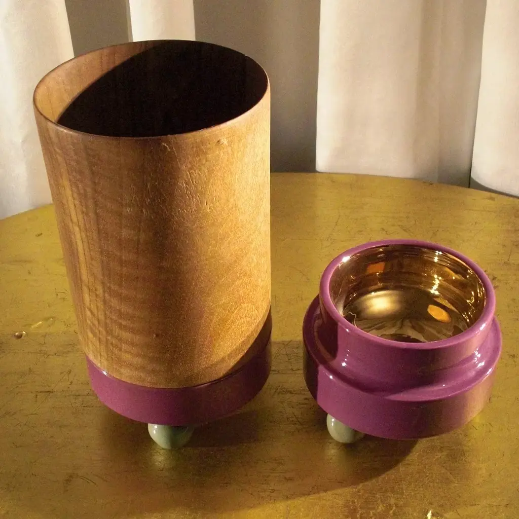 This eclectic objet d'art exemplifies masterful craftsmanship and the endless and alluring potential of interlocking volumes. It can serve as a box with a lid, a glamorous sculpture, or as two separate vases once the lid is pulled out from the wooden cylinder. Its secret and imaginative design combines hand-turned wood with fine majolica elements glazed respectively in purple, gray, and finished in gold through the third firing step. Slight differences from the picture attest to its artisan nature.