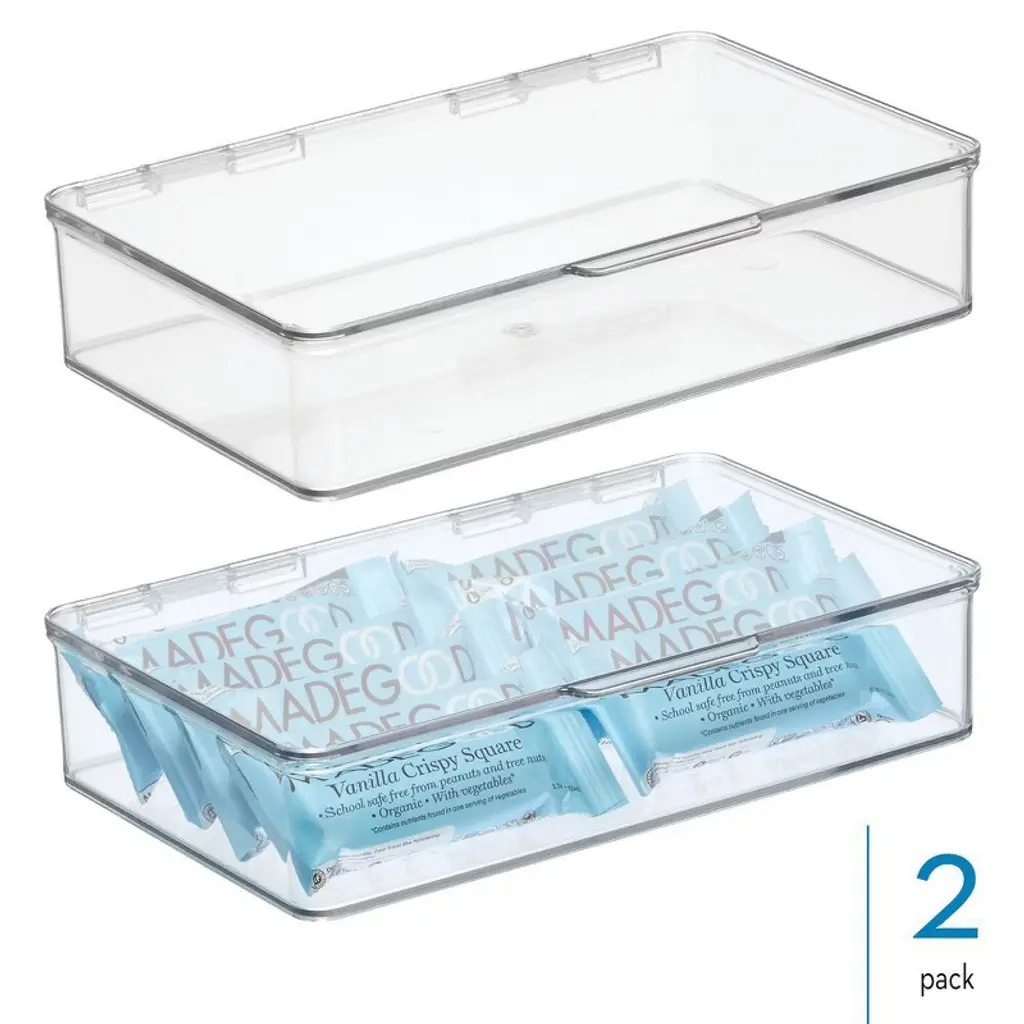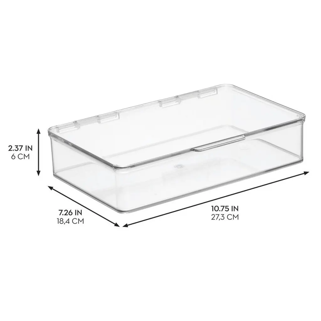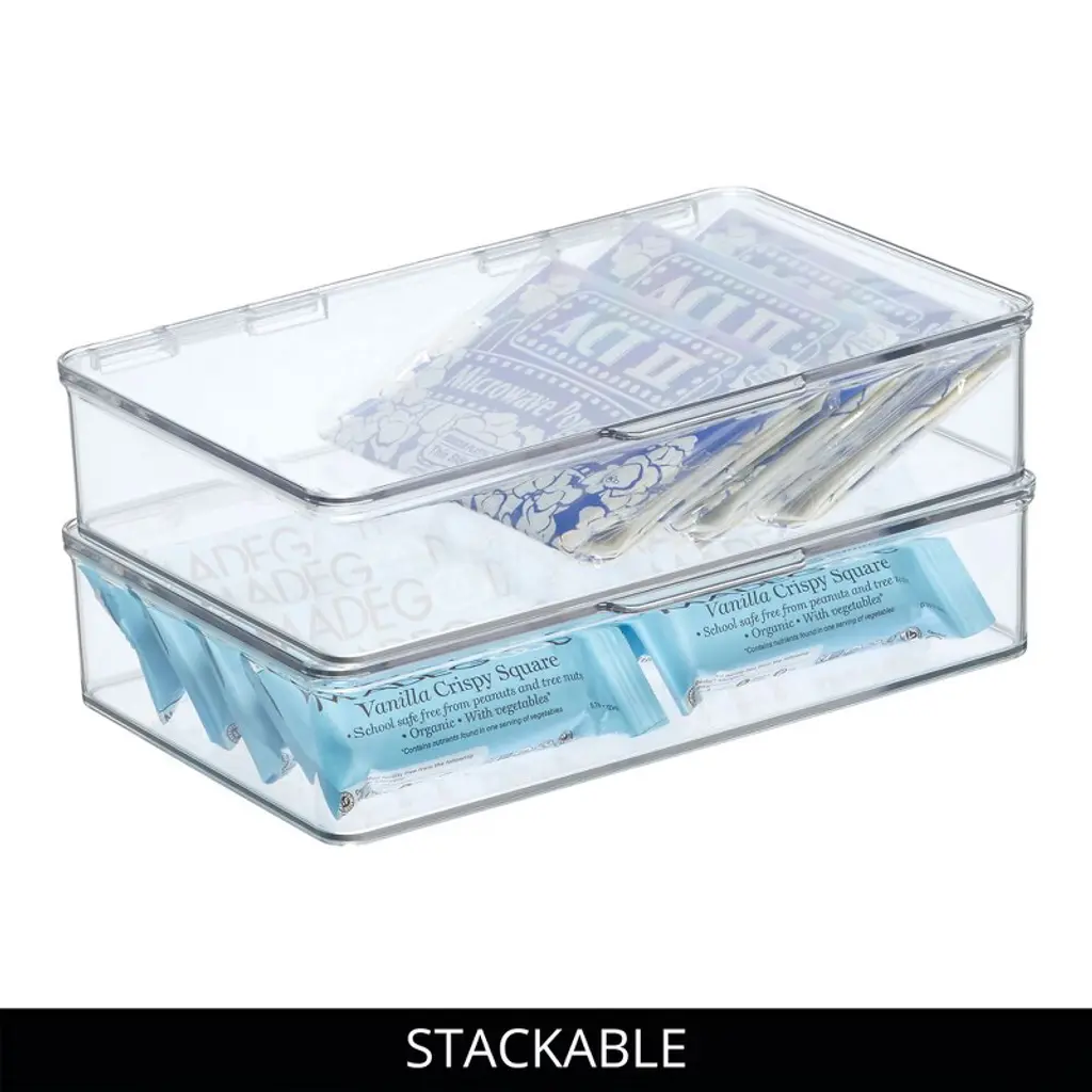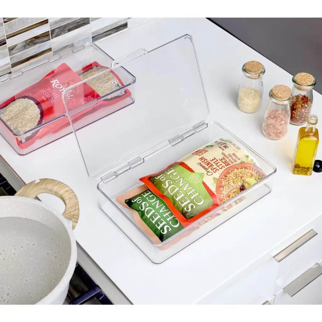 Create a spare, clutter-free pantry with our iDesign Hinged-Lid Storage Box. Perfect for organizing everything from small kitchen gadgets to your most reached-for pantry staples, the clear design provides easy visibility, making it easy to find what you're looking for. The durable plastic construction ensures items are protected while remaining accessible and visible thanks to the built-in hinged lid. This easy-open lid enables you to stack and store, creating space-saving vertical storage. Designed with versatility in mind, this lidded storage box works beyond the kitchen and organizes offices, closets, bedrooms, craft rooms, or anywhere else throughout the home that needs organizing. With iDesign, you can live simply every day.