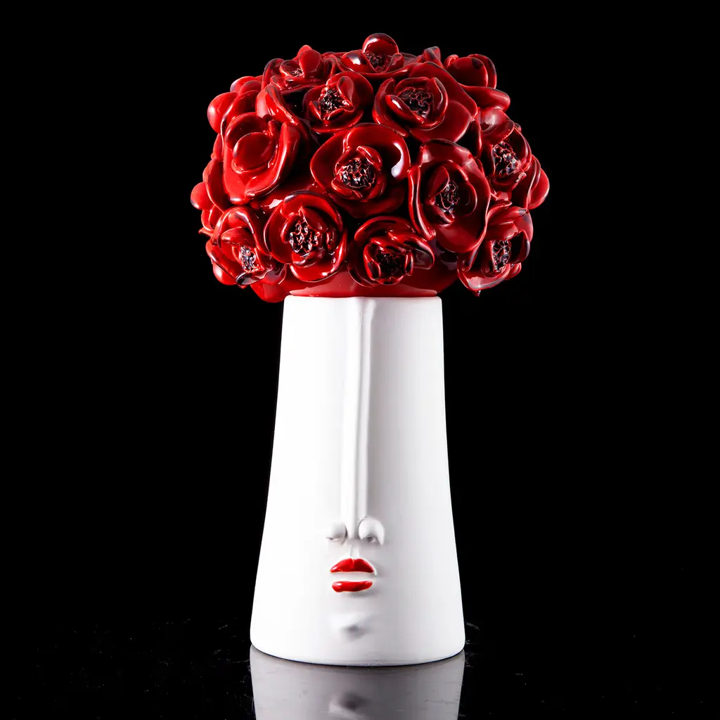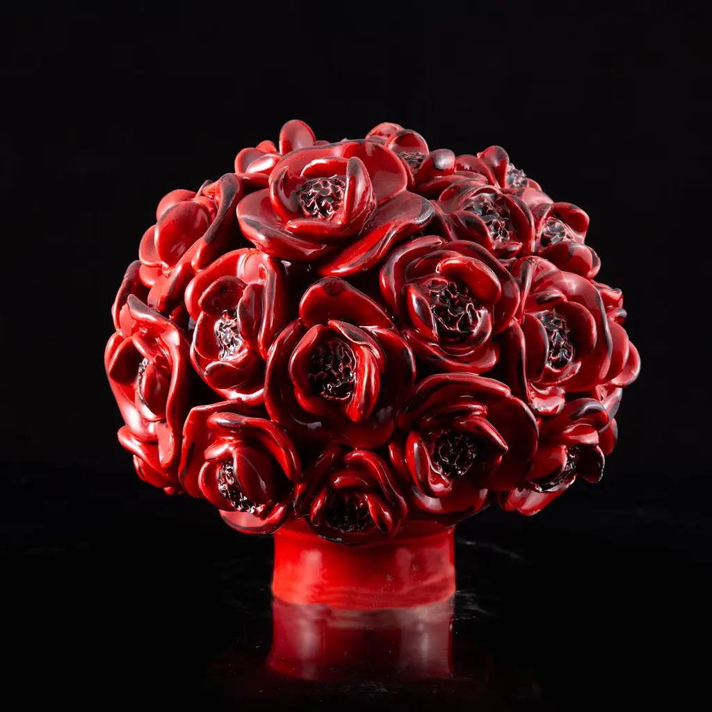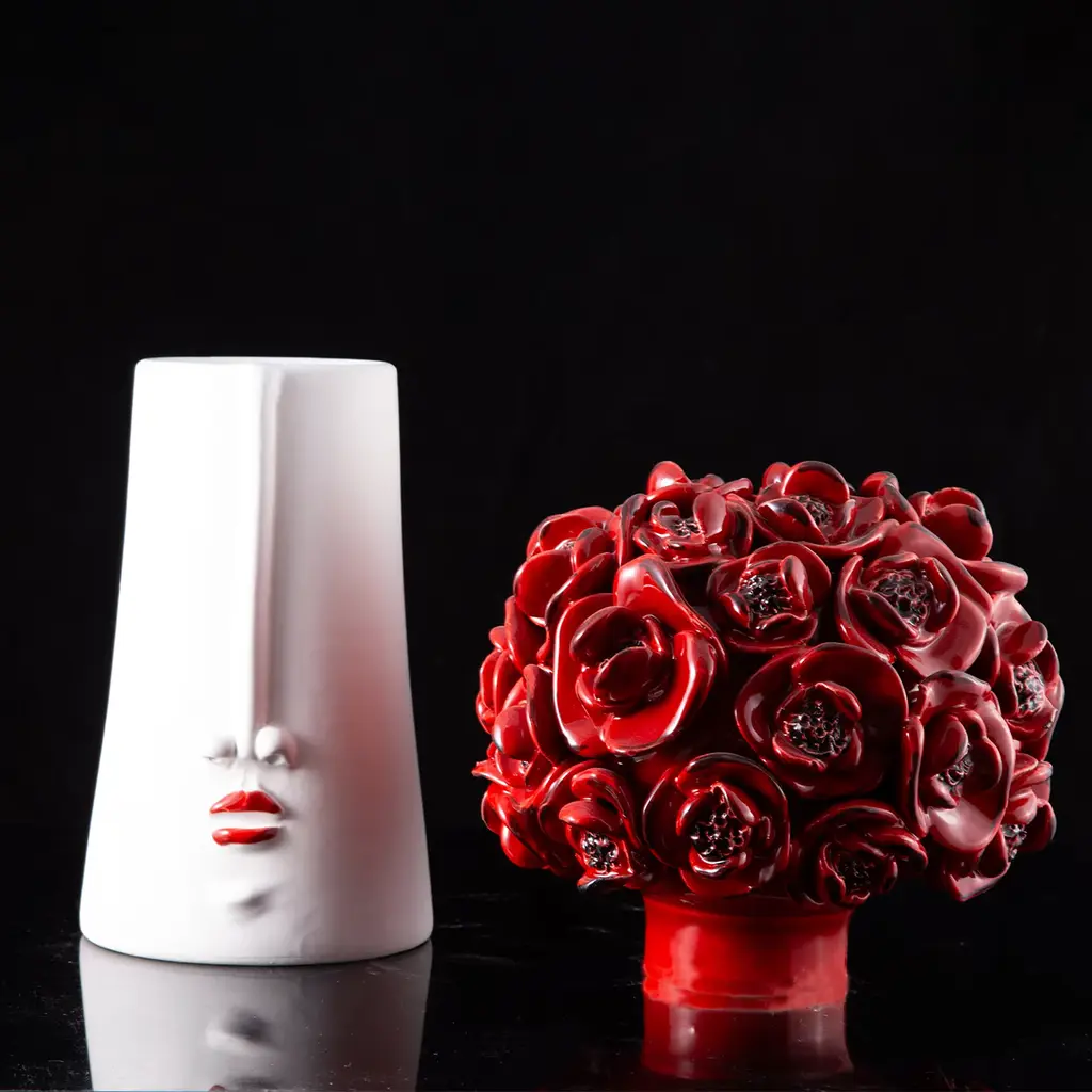 Marked by anthropomorphic traits immediately revealing its playful sculptural allure, this ceramic piece will be a precious ornament for the table. A bouquet of vibrant-red poppies gets sculpted from the lid, which lifts to reveal a practical a wide storage compartment. Multiple variants can be explored in the Artemest catalog.