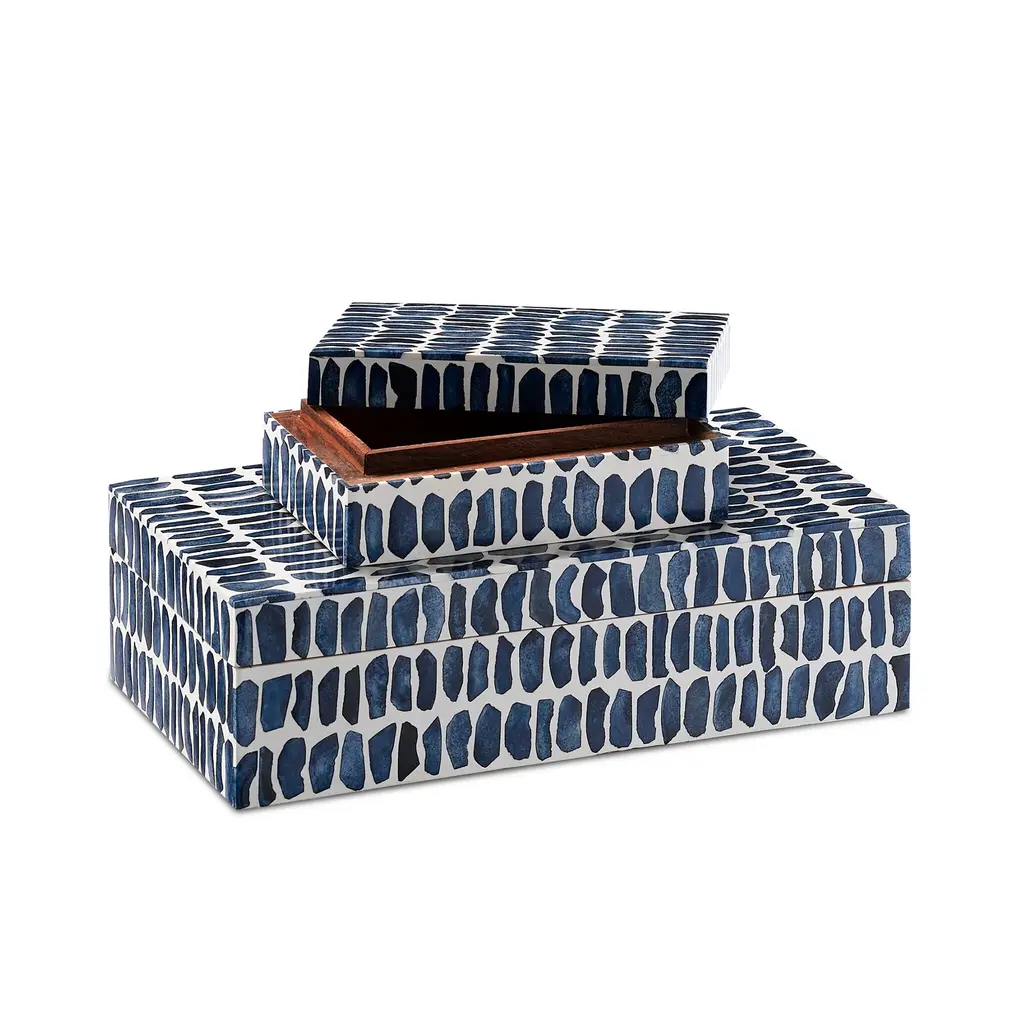 Our Indigo Box Set includes two blue and white boxes that are textural and playful. The pair of white and navy blue decorative accessories are covered in indigo blue bone and composite. Ships In 7-10 Business Days This image is for illustrative purposes only. The colors shown are accurate within the constraints of lighting, photography, and the color accuracy of your screen.