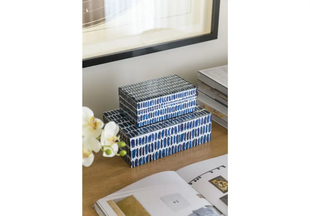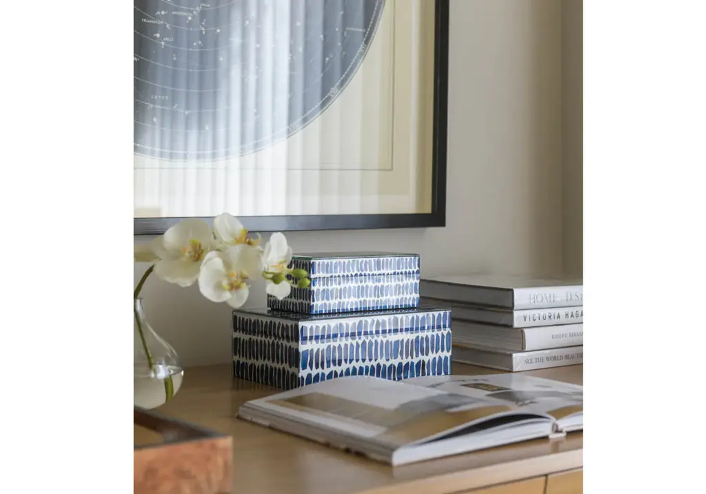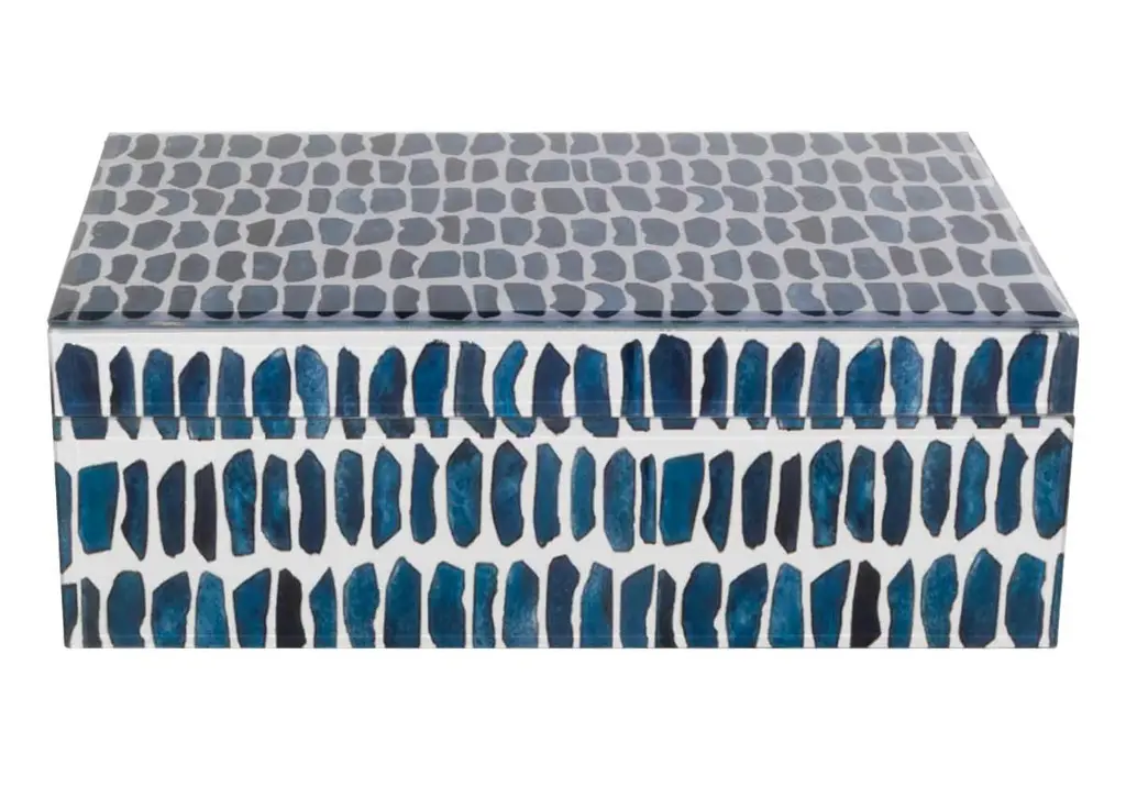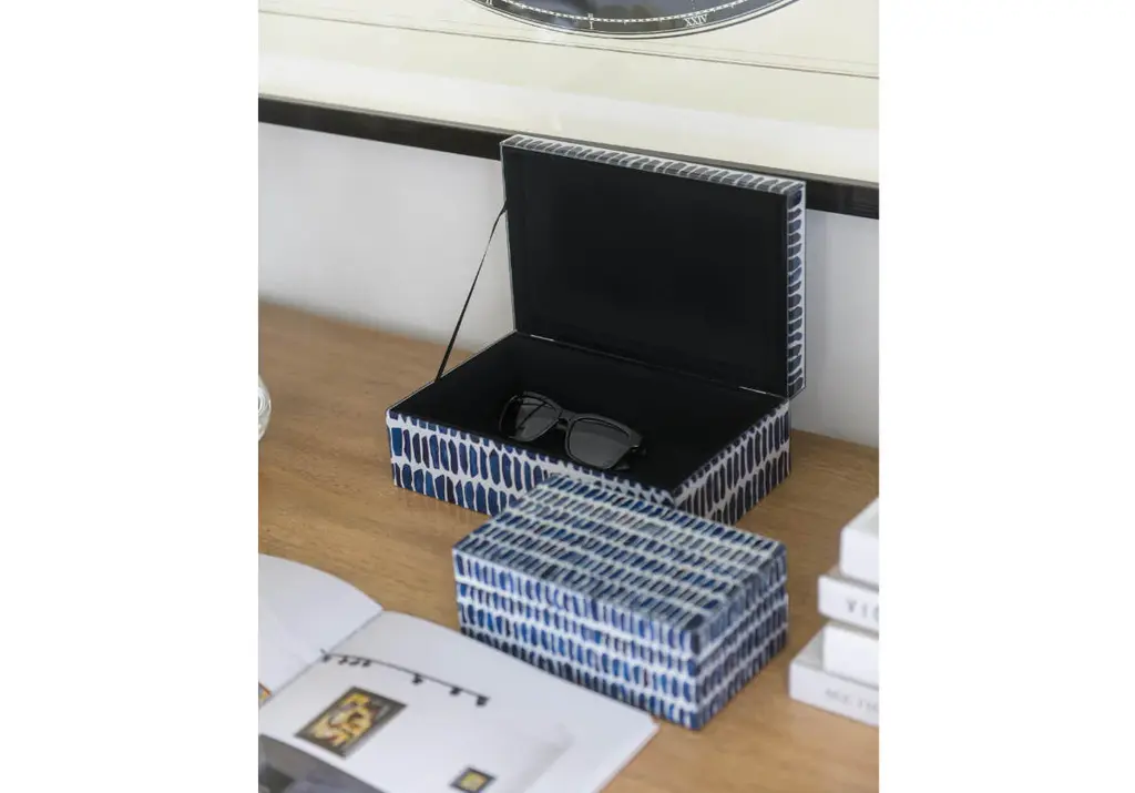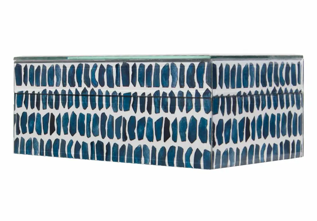 Final Sale A beautiful addition, this box showcases indigo toned brushstrokes covered by a beautiful glass casing. Easily stow electronics, cords, jewelry, and more. Style alone or pair the boxes together for a complete set.