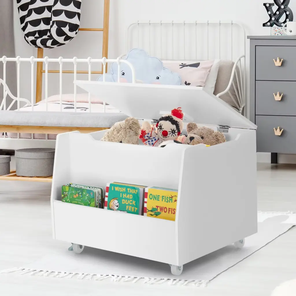 In addition, 4 360° rotating wheels (2 lockable) are easy for small children to move. There are 2 storage compartments to accommodate and display children's toys, books, stuffed animals, sports equipment, craft supplies, clothing, etc. In addition, safety hinges prevent the lid from falling and from closing suddenly to catch a child's hand. It will keep your child's bedroom organized and help him/her develop good storage habits. The mobile storage organizer comes with a clamshell to keep toys or other items out of sight and dust out.Color: White Material: MDF, PP Overall Size: 24" x 19" x 18"(W x D x H) Weight Capacity of Top: 100 lbs Weight Capacity of Inside: 80 lbs Net Weight: 30 lbs Package Includes: 1 x Toy Storage Box with Wheels 1 x Accessories Bag 1 x Instruction