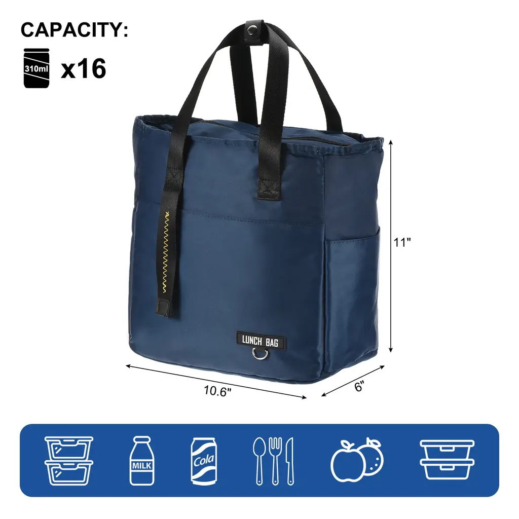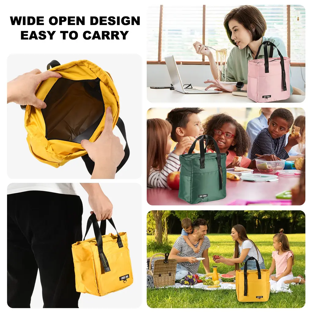 LEAKPROOF & DURABLE - Our reusable lunch bags have reinforced edges to prevent liquids from leaking into the lid and carrying heavy loads without tearing or deforming. If there is liquid spillage inside, just wipe it with a napkin, easy to cleanKEEP FOOD WARM & COOL- This cooler lunch box bag is designed with 3 layers of thermal insulation material, the outermost layer is waterproof polyester fabric, the middle is thickened pearl cotton, and built-in leakproof PEVA, which can effectively isolate the air, reduce heat loss, keeping your items cool or warm, ensuring optimal freshness.LARGE CAPACITY - Our insulated grocery bags have a large capacity, measuring 10.6"(L) x 6"(W) x 11"(H) with a three-dimensional bottom design. It provides ample space to hold lunch boxes, fruits, desserts, drinks, etc., suitable for all-day meals for one person or lunch for many people.MULTI-FUNCTIONAL - Our lunch bag for women has multiple pockets with plenty of space. The front pocket can be used to store notebooks, keys, wallets, etc., and the side pockets can be used to store personal items such as water bottles, pens, etc., making it easy to carry to work and out.MULTICOLOR FOR CHOICE - We offer reusable lunch sacks in a variety of colors to choose from, including pink, yellow, blue, and cyan. You can choose to buy a variety of colors to easily distinguish the items loaded in the thermal bag to meet your different preferences for colors.WIDE APPLICATION - Our insulated lunch bag is lightweight and portable, perfect for outdoor picnics, camping trips or family picnics, offices, travel, and outdoors, it can keep your food at a better temperature. Suitable for women, men and adults.