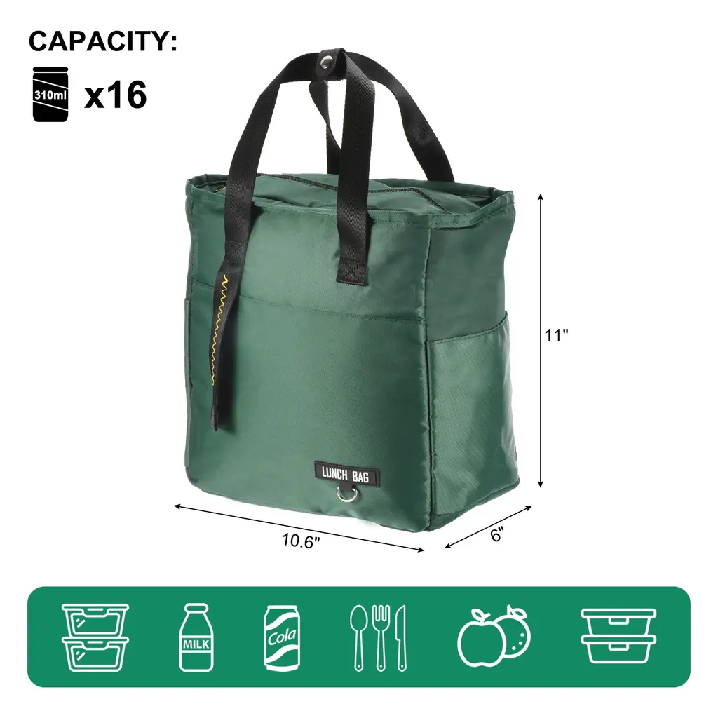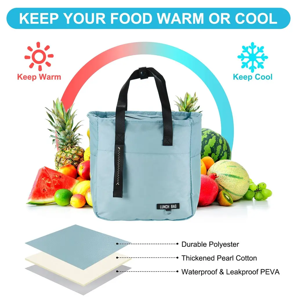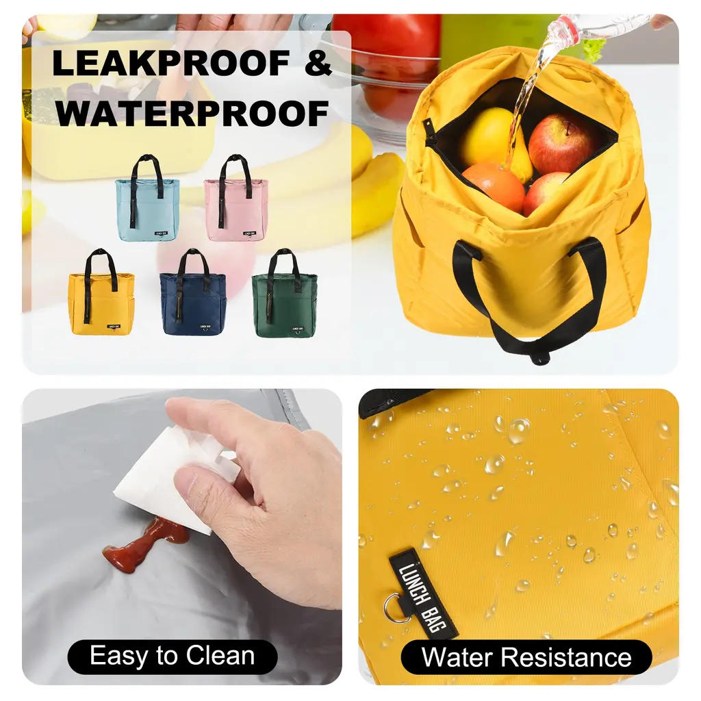 LEAKPROOF & DURABLE - Our reusable lunch bags have reinforced edges to prevent liquids from leaking into the lid and carrying heavy loads without tearing or deforming. If there is liquid spillage inside, just wipe it with a napkin, easy to cleanKEEP FOOD WARM & COOL- This cooler lunch box bag is designed with 3 layers of thermal insulation material, the outermost layer is waterproof polyester fabric, the middle is thickened pearl cotton, and built-in leakproof PEVA, which can effectively isolate the air, reduce heat loss, keeping your items cool or warm, ensuring optimal freshness.LARGE CAPACITY - Our insulated grocery bags have a large capacity, measuring 10.6"(L) x 6"(W) x 11"(H) with a three-dimensional bottom design. It provides ample space to hold lunch boxes, fruits, desserts, drinks, etc., suitable for all-day meals for one person or lunch for many people.MULTI-FUNCTIONAL - Our lunch bag for women has multiple pockets with plenty of space. The front pocket can be used to store notebooks, keys, wallets, etc., and the side pockets can be used to store personal items such as water bottles, pens, etc., making it easy to carry to work and out.MULTICOLOR FOR CHOICE - We offer reusable lunch sacks in a variety of colors to choose from, including pink, yellow, blue, and cyan. You can choose to buy a variety of colors to easily distinguish the items loaded in the thermal bag to meet your different preferences for colors.WIDE APPLICATION - Our insulated lunch bag is lightweight and portable, perfect for outdoor picnics, camping trips or family picnics, offices, travel, and outdoors, it can keep your food at a better temperature. Suitable for women, men and adults.
