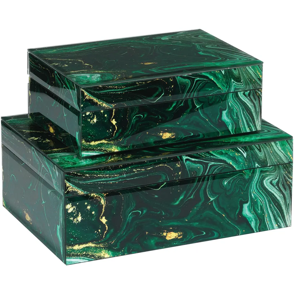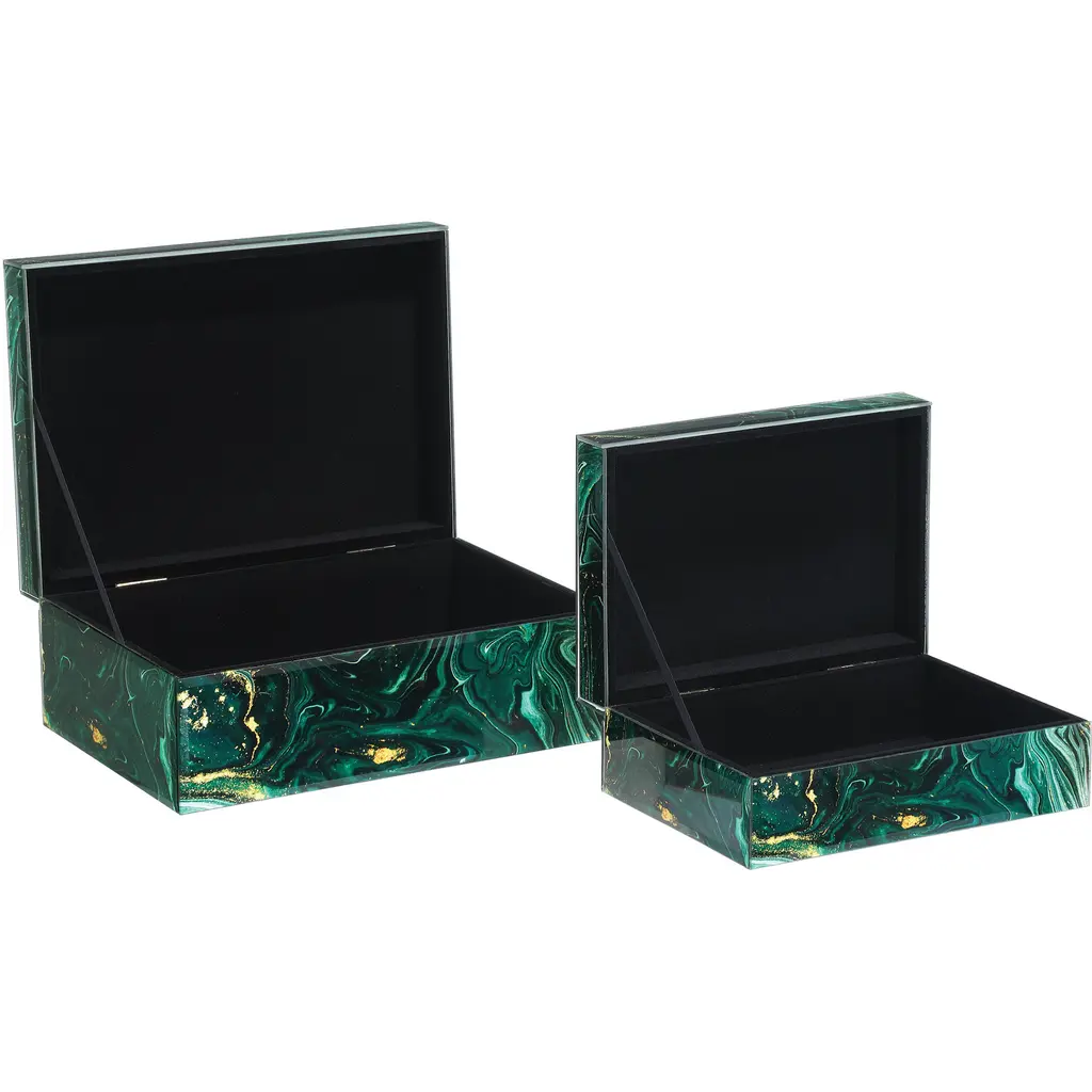 Despite looking like they are made of stone, the Interstellar Green Box Set's surfaces are the result of green swirl paper being encased in glass. The coating brings the exteriors of the decorative boxes an unparalleled sheen. The interiors are covered in black felt, and the small one will nest into the large one. Because these accessories are handmade, the patterns will vary.