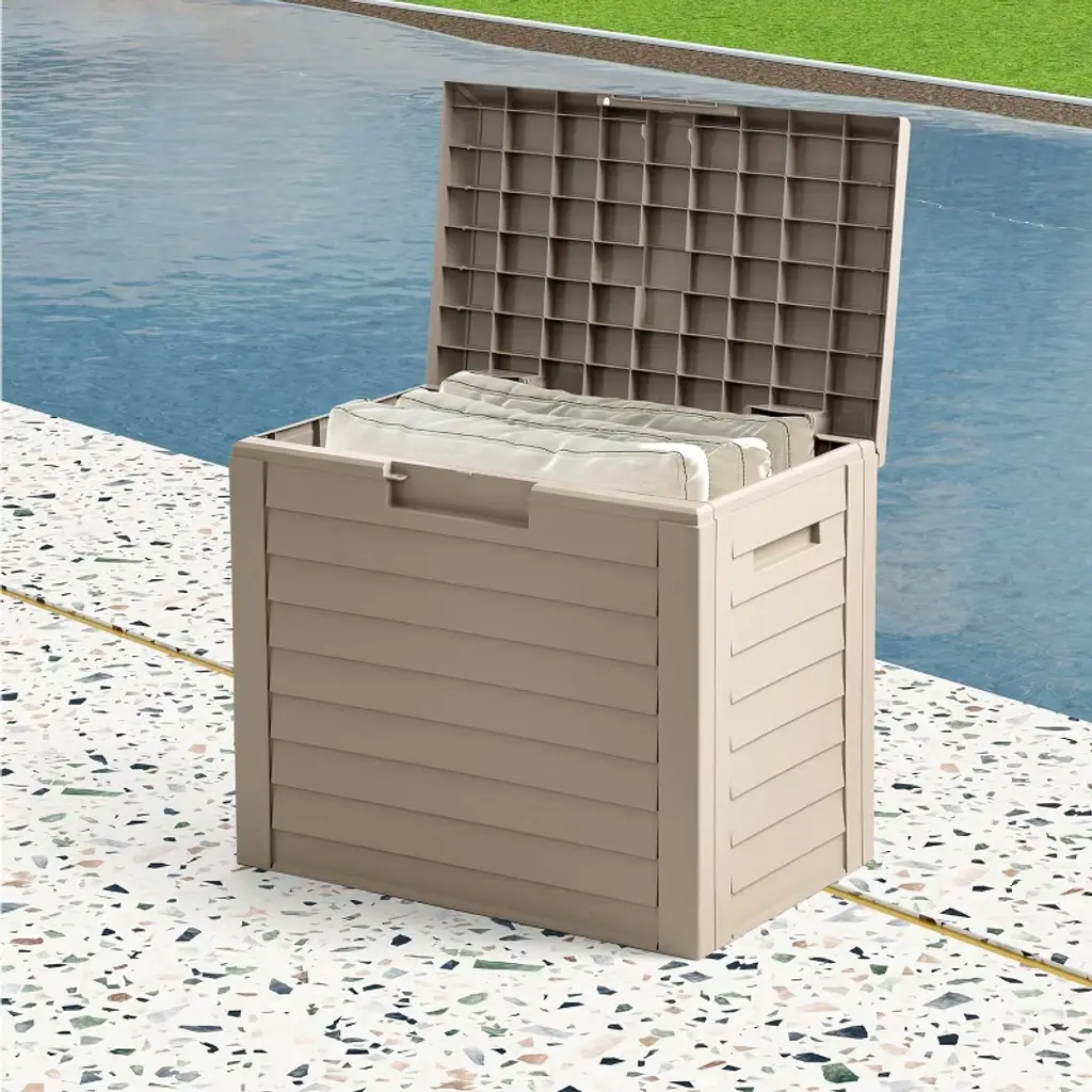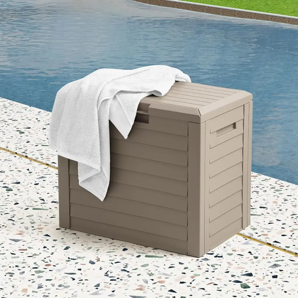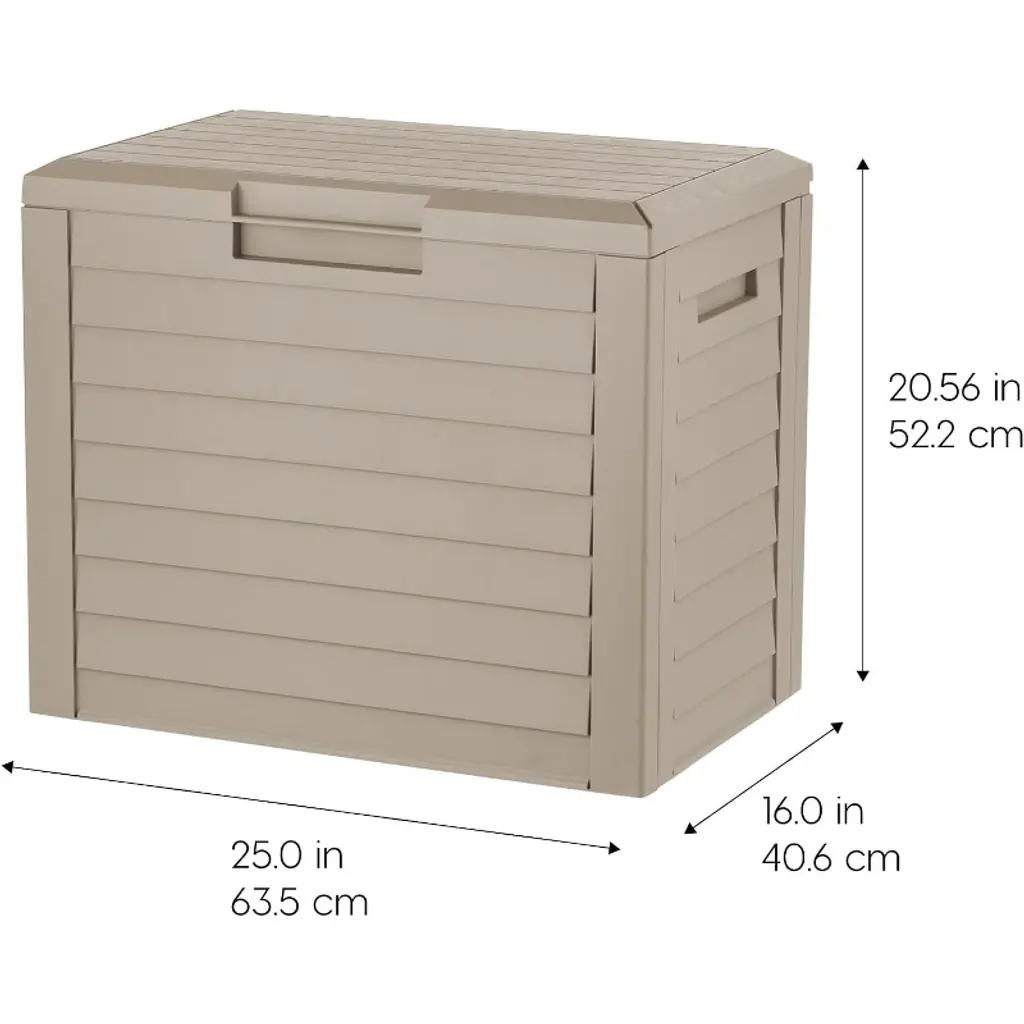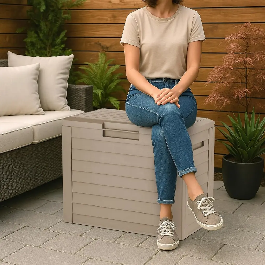 Enhance your outdoor living space with our Beige 35-Gallon Outdoor Deck Box. With a spacious 35-gallon capacity, it’s perfect for storing cushions, garden tools, pool accessories, toys, and more. The padlock hole adds security, ensuring your belongings stay safe. Made from durable, weather-resistant resin, this box includes an ultraviolet (UV) agent to protect it from sun exposure, preventing fading or cracking. Easy-to-assemble panels (lid, front, rear, bottom, and two sides) make setup quick and hassle-free. The sleek beige color and wood-like texture blend seamlessly with any outdoor decor, whether placed on your patio, deck, or in your garden. This versatile box can also serve as a bench or side table, providing extra seating and utility. Keep your outdoor space organized and protected with this durable, UV-resistant outdoor deck box – a practical addition to your home!