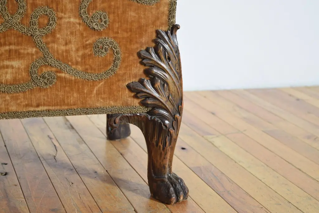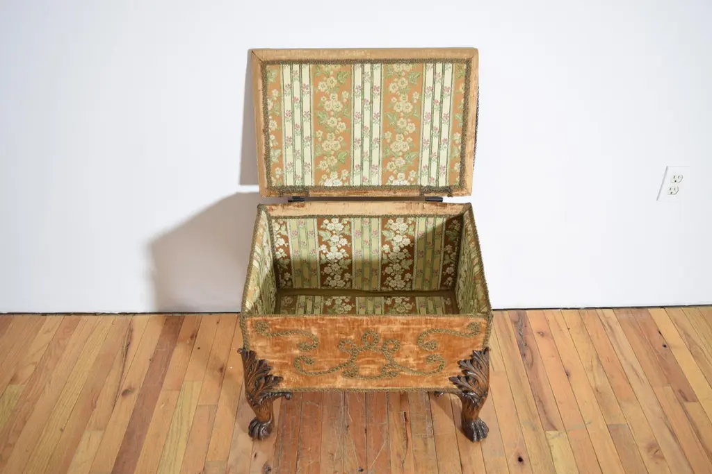 upholstered in original velvet and metallic trim, square in shape with a slanted hinged top, the interior also upholstered, raised on elaborately carved lions paw feet