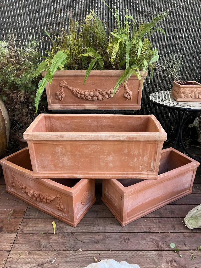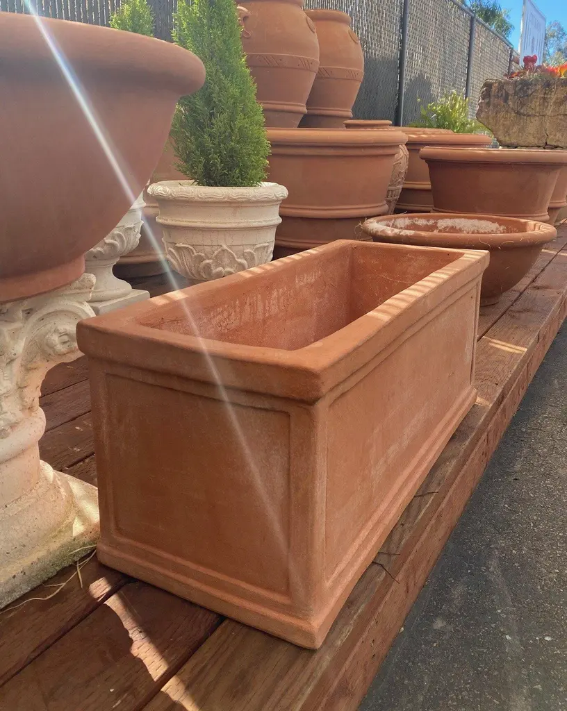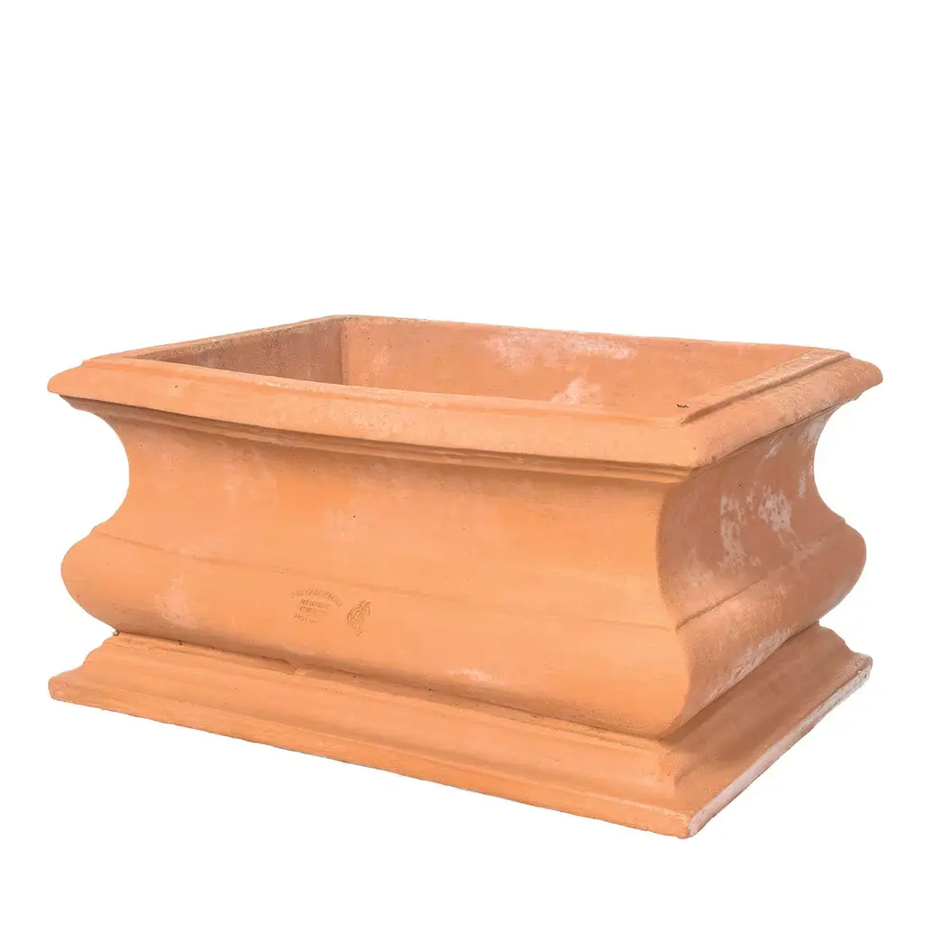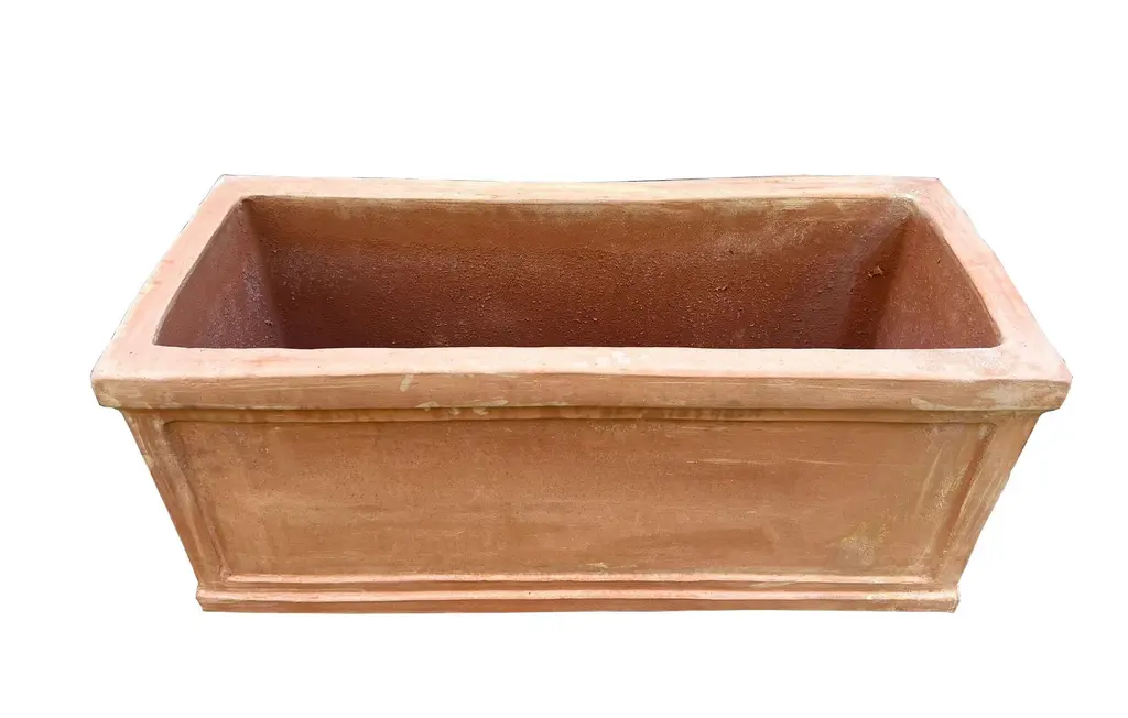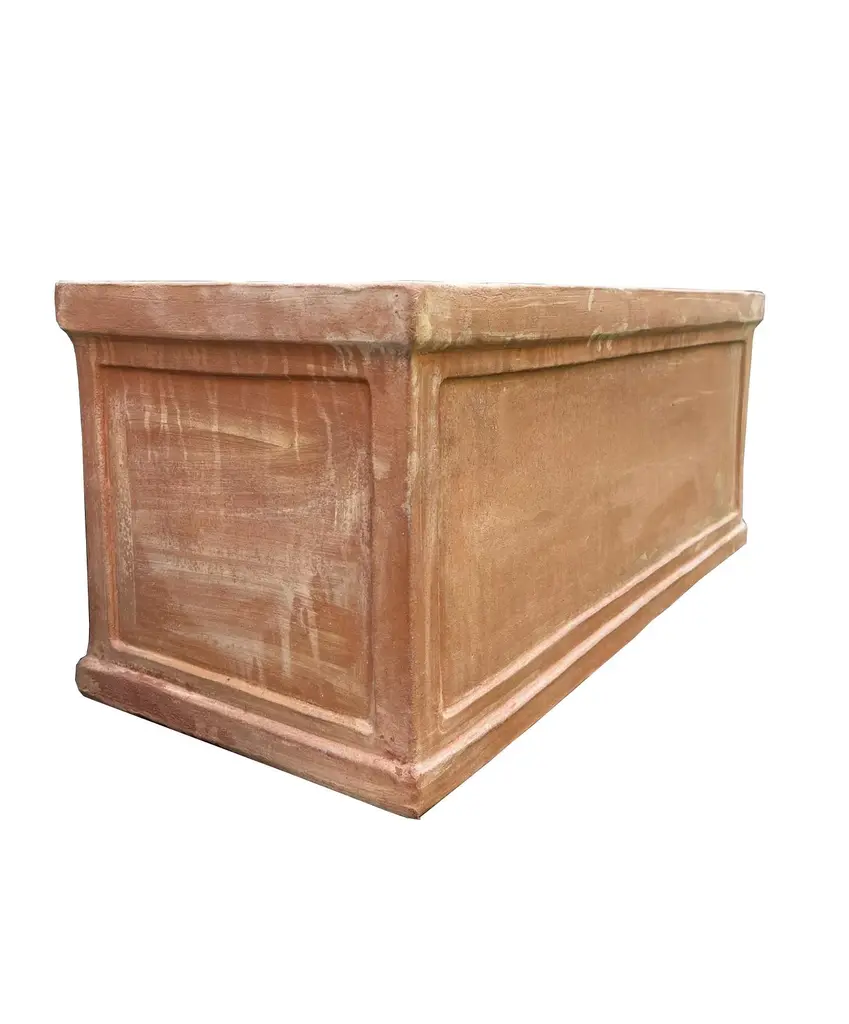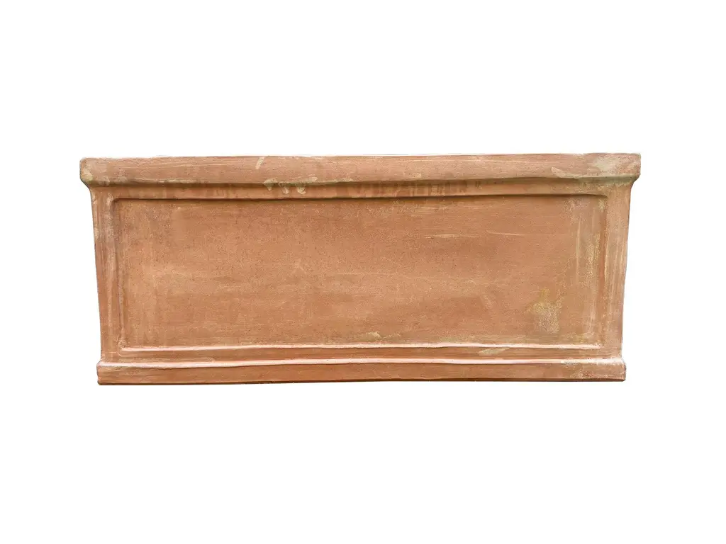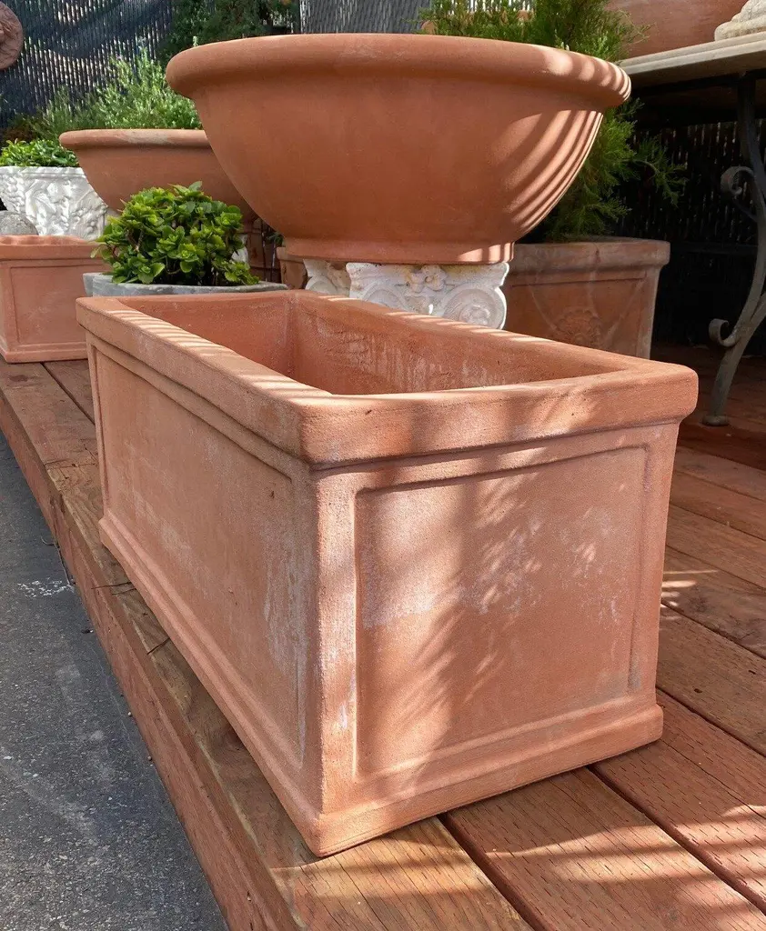 Directly Imported from Impruneta Tuscany, this handcrafted Terracotta rectangular planter with simple line, plain with double edge detail all around it is the ideal planter for plants & shrubbery. Hand-made. External Dimensions: 31.5" W x 13.5" D x 13.5" H Internal Dimensions: 29.5" W x 10" D x 12.5" H Our pottery is the finest in the world directly imported from the famous Tuscan’s hill Impruneta where the combination of the region’s clay and special firing process creates a durability to last for generations. Enduring immense cold and fierce heat Impruneta pottery withstands the test of time. And the beauty and craftsmanship is unparalleled. They are water, salt and freeze resistant.