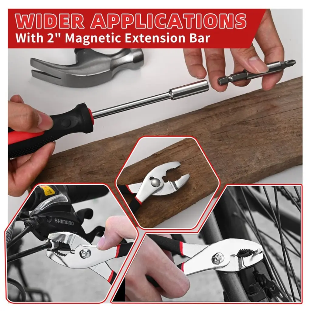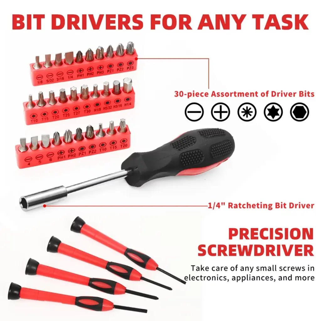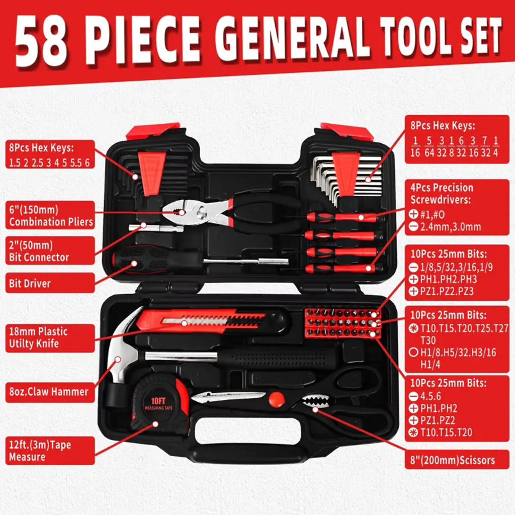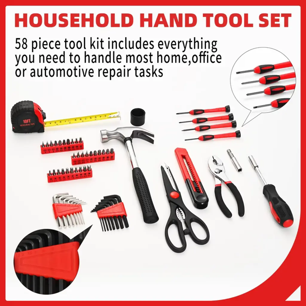 Discover this 58 - piece tool set, a must - have for home repairs. Crafted from premium materials, it offers durability and reliability. The set comes with an 8 oz claw hammer, 30 screwdriver bits, and many other useful tools. It's perfect for daily home projects like furniture assembly and picture hanging. Whether you're in an apartment, dorm room, or garage, this tool set is your go - to. The tools are neatly organized in a hard plastic case, making storage a breeze. It's not only a practical tool for basic household repairs but also an excellent gift for new grads or those moving into a new home, bringing convenience to your daily life.