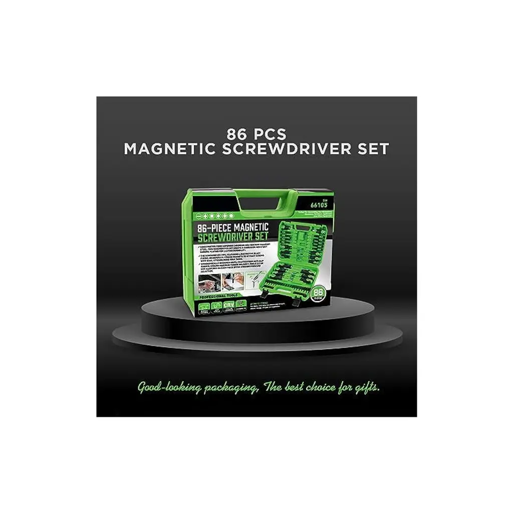 Discover this 86 - piece magnetic screwdriver set, a must - have for any DIYer or professional. Made from premium chromium molybdenum vanadium steel, it's corrosion - resistant after chrome plating, offering long - term durability. The strong magnetic tips with a black - finish blade effortlessly attract screws, speeding up your work. The PP and TPR grip provides maximum torque, and the printed sizes on the bits make selection a breeze. The set includes various types of screwdrivers, bit sets, and nut drivers, along with a magnetize & demagnetize tool. It comes in a handy storage box for easy transport. Whether you're working on household appliances, assembling furniture, or doing automobile repairs, this set meets all your needs. It's also a great gift for those who love DIY projects, bringing convenience and efficiency to your life.