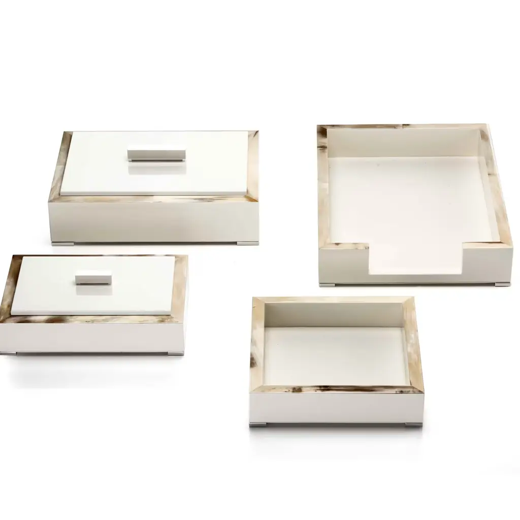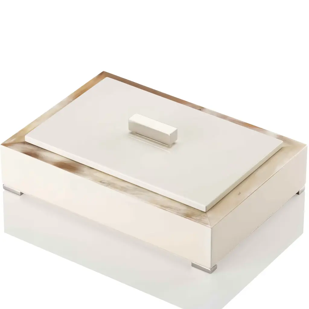 Exuding a lavish flair intertwined with its geometrical design, this refined ivory storage box showcases a precious structure in horn and wood and a rectangular lid in the same lacquered, glossy finish with a chromed brass handle. The interior is enriched with valuable Tosca leather to increase the exquisiteness of this piece.