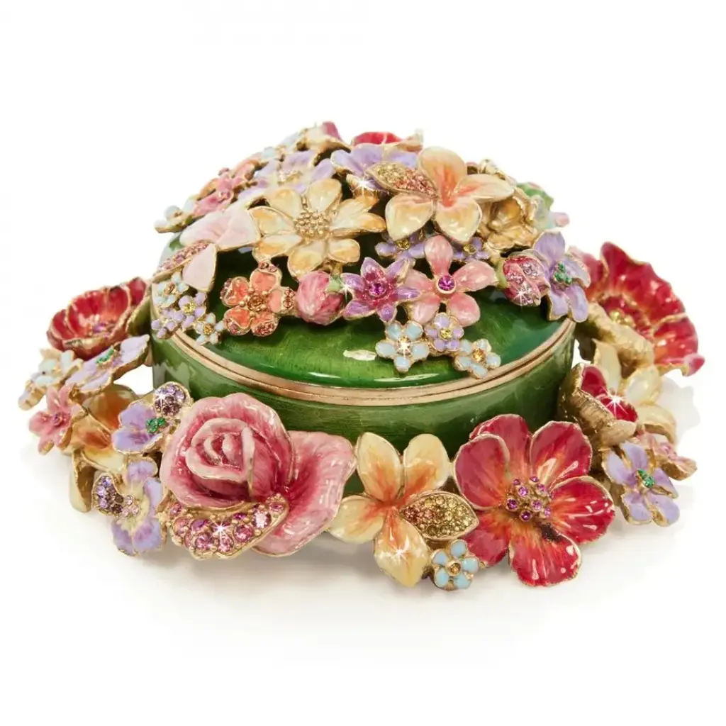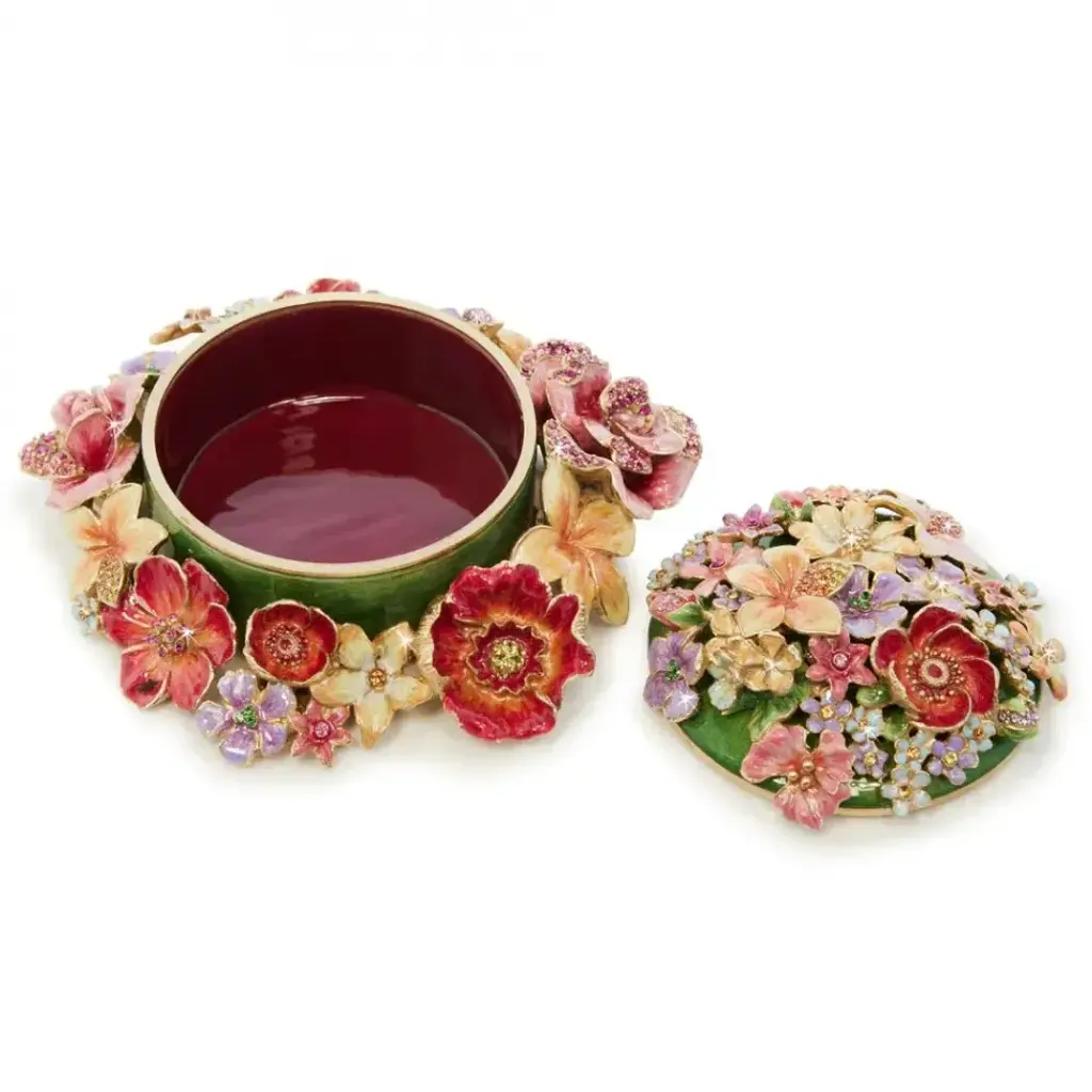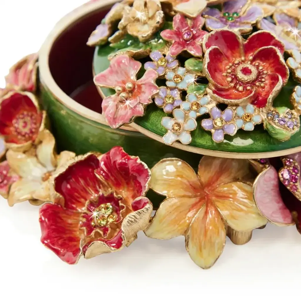 A rainbow of flowers cascades down and around the charming Ivy Bouquet Box. Fill with your treasures or gift to your loved ones. This box is hand enameled with stunning shades, plated in 14K gold and the sparkling crystals are meticulously handset on each flower's petals.