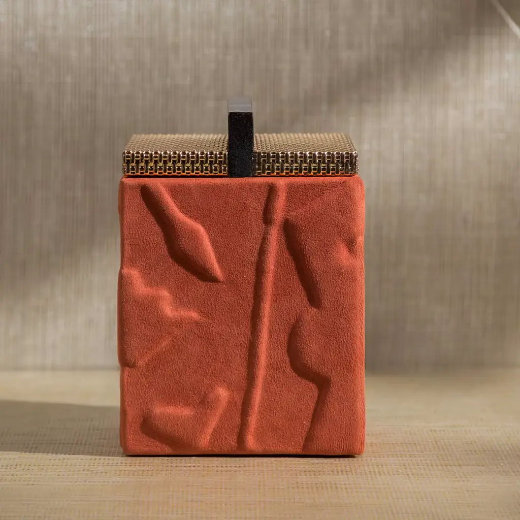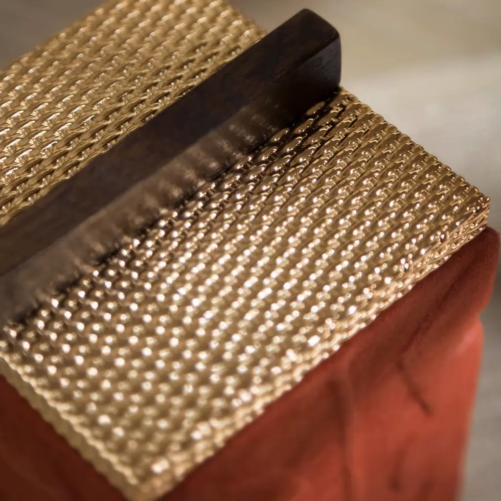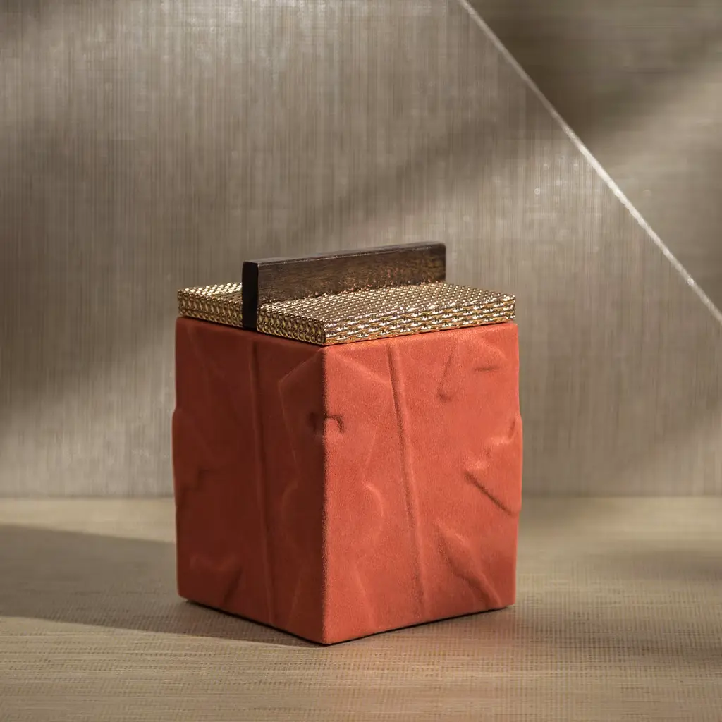 Pure geometric volumes evoking Rationalist architecture merge with primitive artistic accents in this precious box. The raised motif enlivening the solid Canaletto walnut structure was inspired by pre-Columbian figures, while the mesh-like texture enriching the brass-finished metal lid has its dazzling look interrupted by a linear wooden handle echoing the rigorous volumes typical of Rationalist style. A luxe upholstery in coral-hued Nubuck leather seals the design.