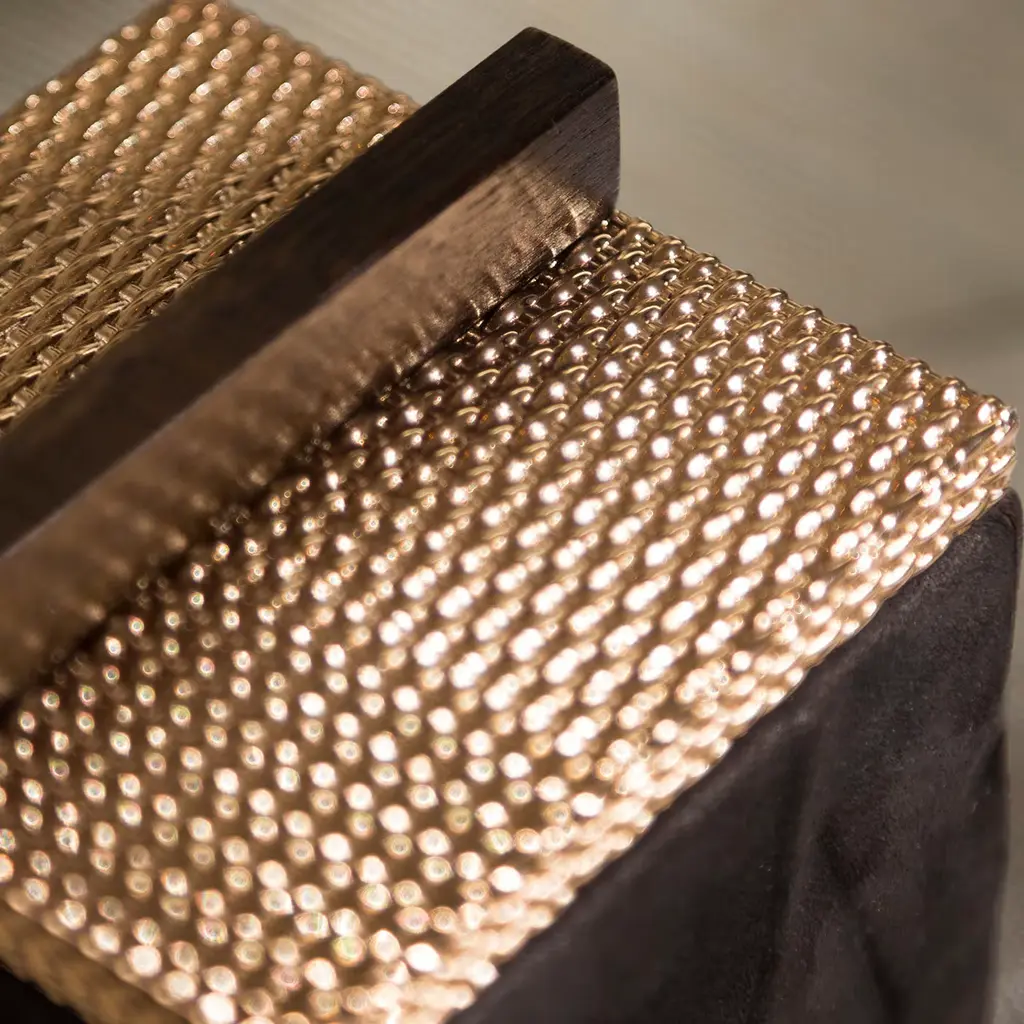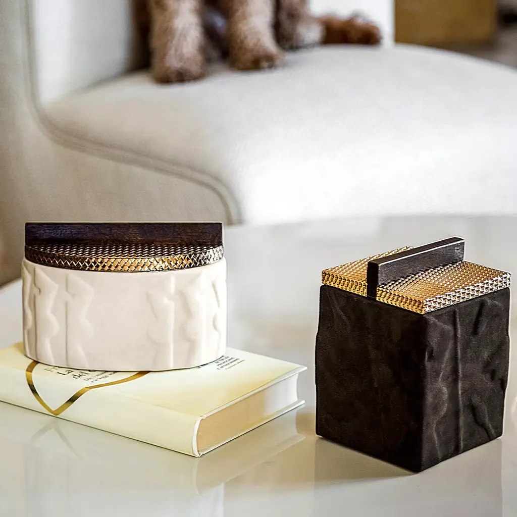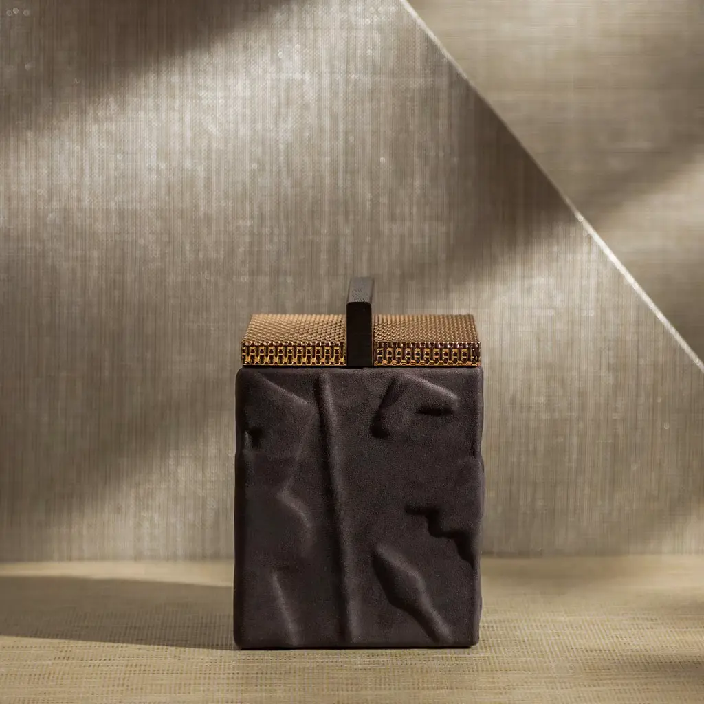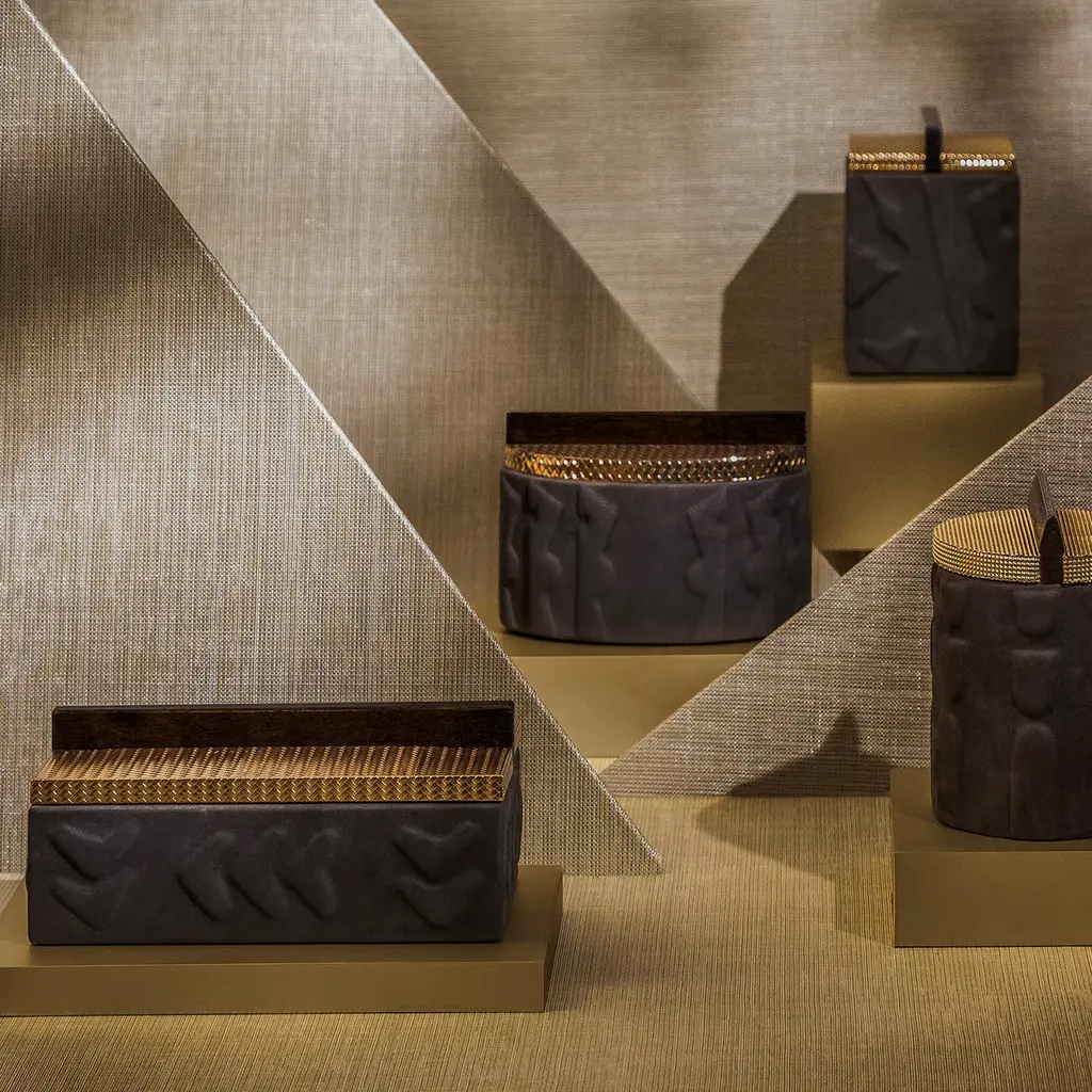 A precious case for jewel favorites, this exclusive box is a synthesis of tailored craftsmanship and delicate artistic references. The frame in solid Canaletto walnut flaunts a raised pattern of figures inspired by pre-Columbian art and dressed in a black Nubuck leather suit for a superb tactile feel. Marked by a pleasant mesh-like texture and equipped with a linear wooden knob as a subtle homage to Rationalism, the metal lid seduces with its glaring brass finish.