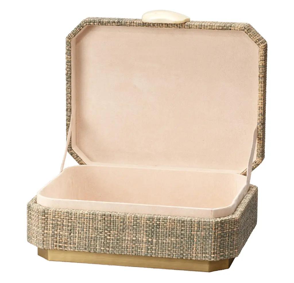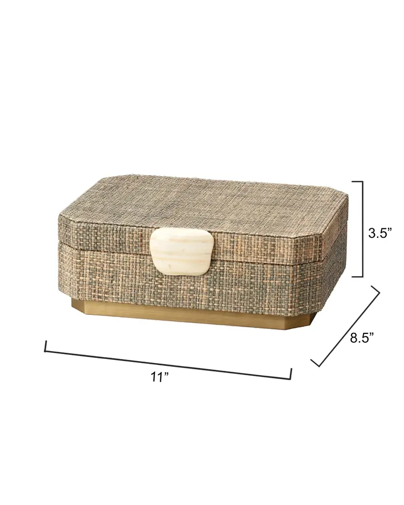 Beautiful bone is paired with woven raffia to create a decorative box of unusual beauty. Lined with Chambery fabric, it can store everything from extra chargers to treasured correspondences in style. With an easily integrated neutral palette and bold but simple design, it also makes an ideal addition to a desktop. Crafted of Raffia Chambrey Fabric Lining with Ribbon Stopper Ivory Ox Bone Accent Antique Brass Base: 0.75"H x 10"W x 7.5"D The inherent variations in tone and texture of natural raffia is preserved, to create pieces rich in detail and natural beauty. These unique imperfections give our products character and individuality, with each piece having its own personality. We’ve done our best to represent product as closely as possible; however, different lighting and settings in photography, phone or computer settings may slightly affect color and appearance. Inside Dimensions 2.75"H x 10"W x 7.5"D Care Instructions: Clean dust with a soft cotton cloth. Spills to be blotted clean immediately. Assembly Required? No