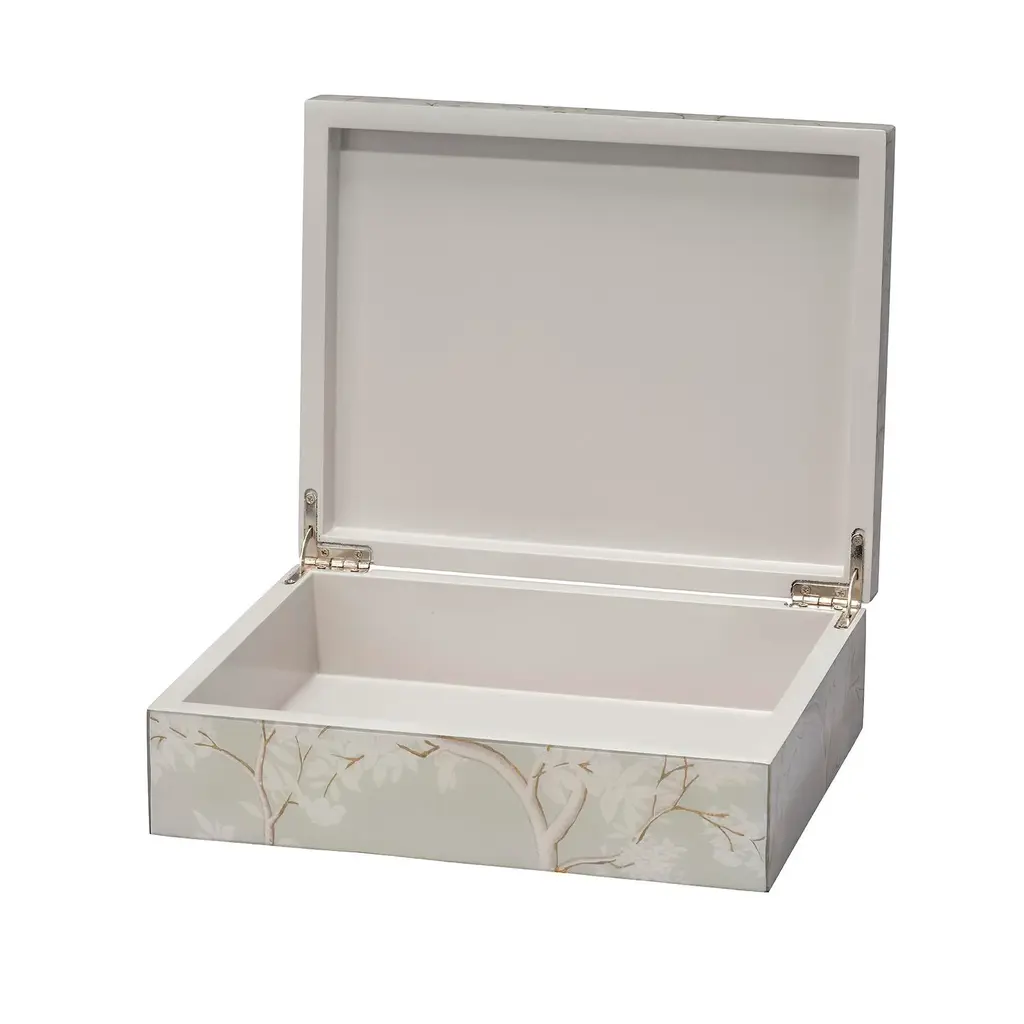Timeless beauty of these small boxes channels the peace and perfection of branches in full bloom. A new way to add a touch of color to an otherwise neutral décor, the handcrafted pieces are certain to become treasured family heirlooms. Materials: MDF, Lacquer, Paper