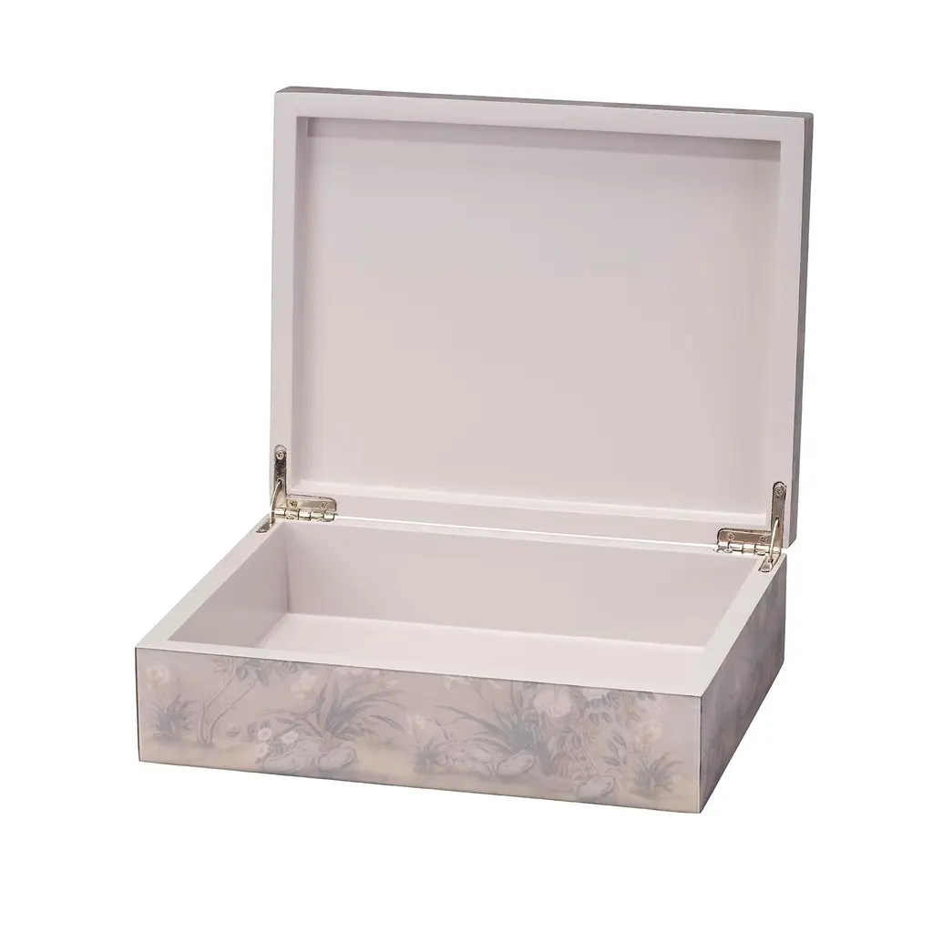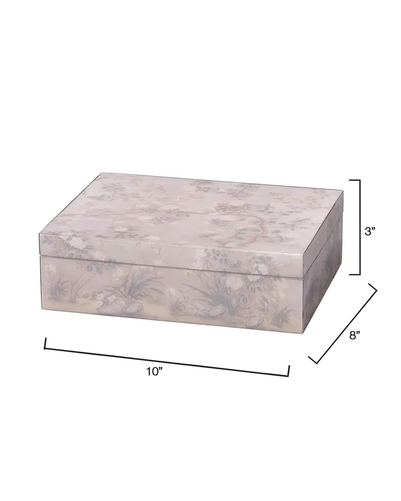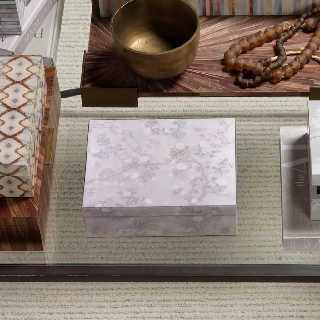 Timeless beauty of these small boxes channels the peace and perfection of branches in full bloom. A new way to add a touch of color to an otherwise neutral décor, the handcrafted pieces are certain to become treasured family heirlooms. Materials: MDF, Lacquer, Paper