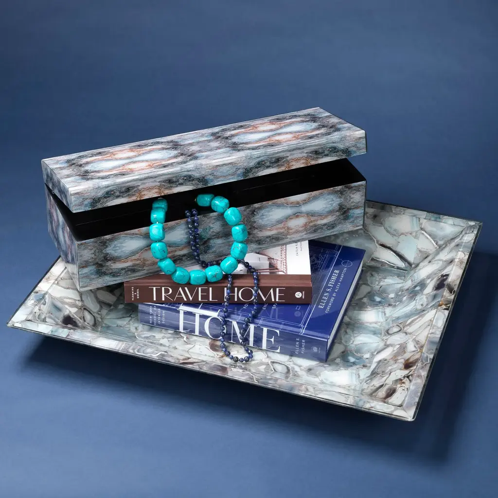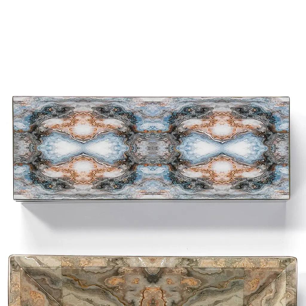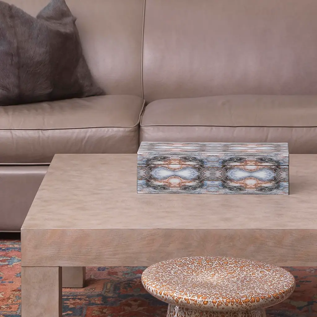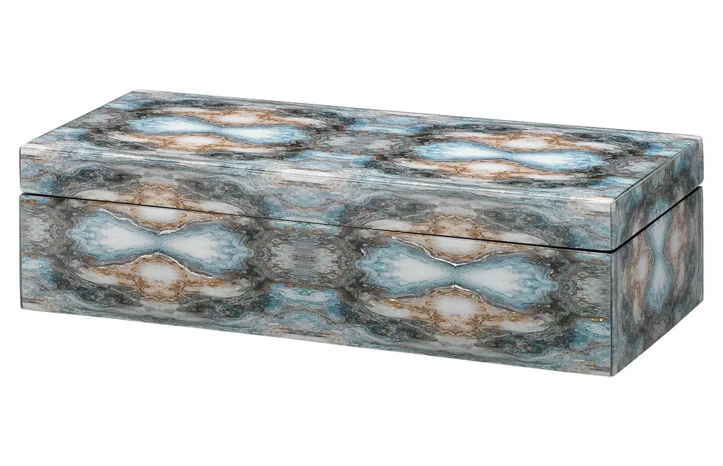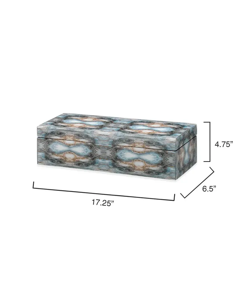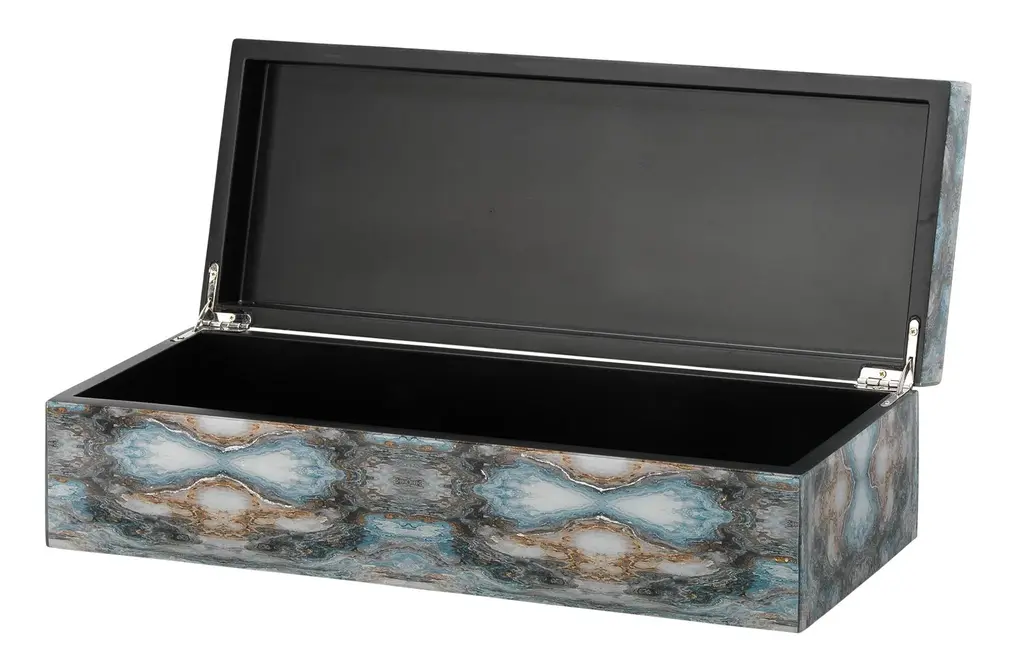Inspired by Rorschach inkblots tests, known to examine emotion through interpretation, our Rorschach Long box inspires you to look closer into the bold tones of indigo, navy and cream, accented with silver and gold leaf. These components create dynamic patterns through overlaid photos underneath a clear lacquer. Paper