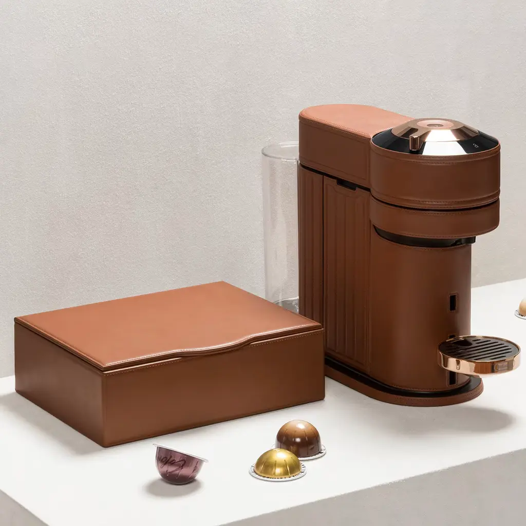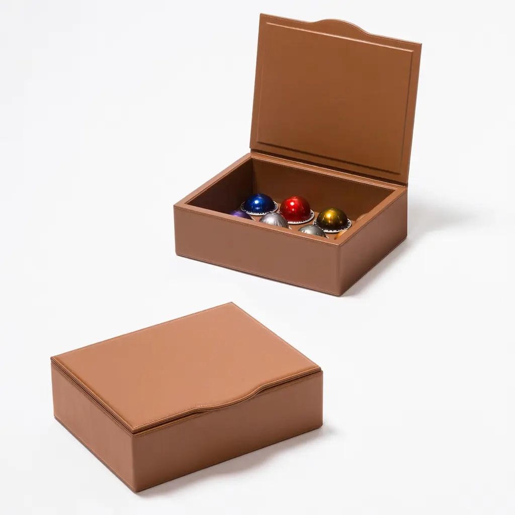 Leather-covered wood structure with hinged lid. Customizable on request.