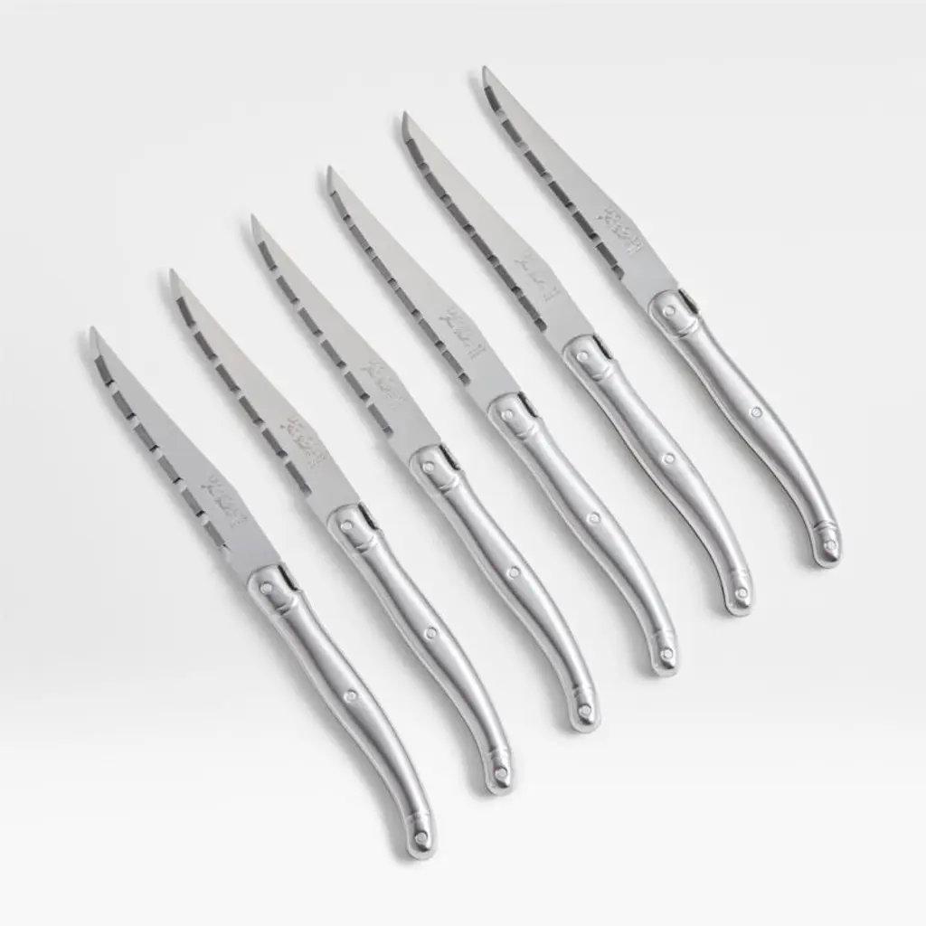 Charmingly detailed with the company's signature bumblebee, the steak knives in this six-piece set are crafted by Laguiole of France, a factory renowned for its exceptional cutlery. Full-tang stainless steel blades are micro-serrated for precise cutting, matched with beautifully brushed handles. Knives nest in a handsome open black storage box, making for safe storage or a lovely gift presentation.