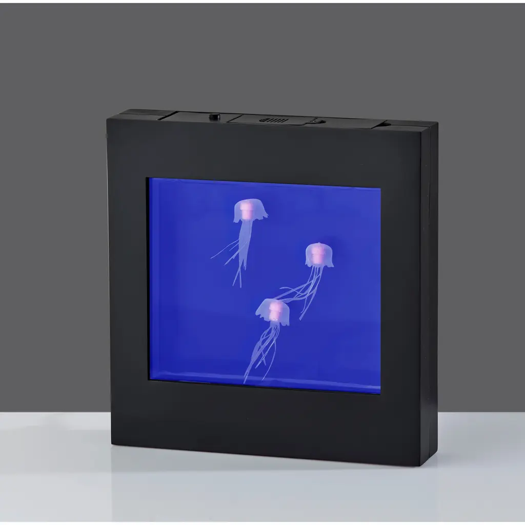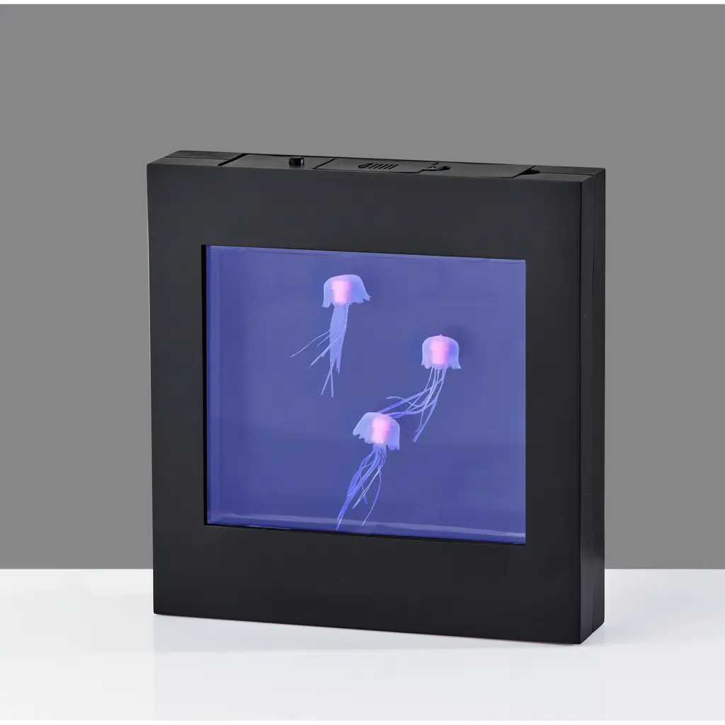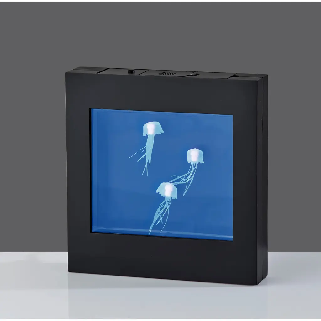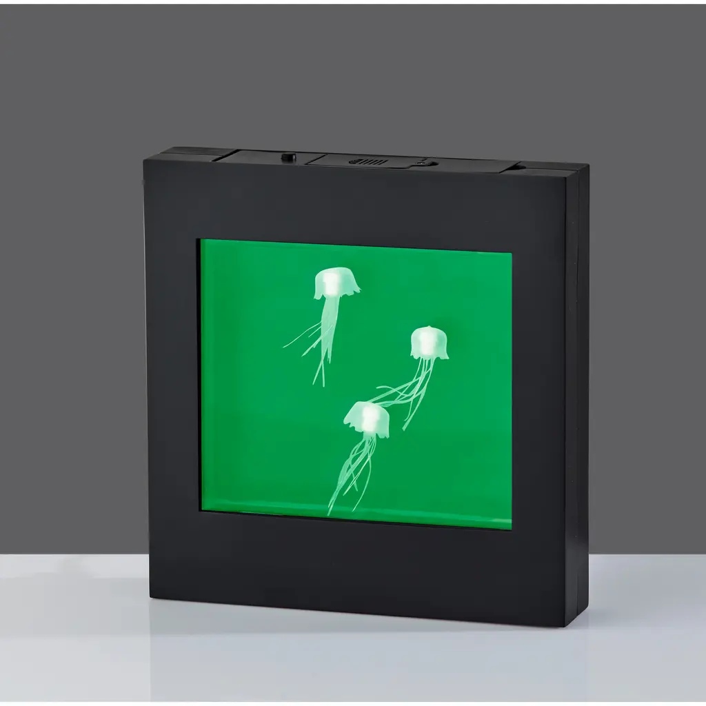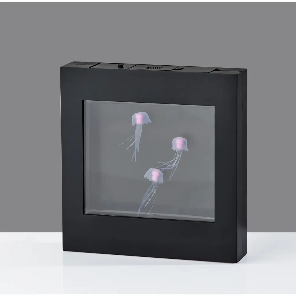 Who could not use a calming influence? This Jellyfish Motion Light Box by Simplee Adesso provides the perfect soothing light for any room and can be wall mounted as eye-catching wall art or can stand free on tables, shelves, nightstands, or counters. Measuring 8.75" tall by 8.5" wide including a black plastic frame, this light box includes a 6.25"tall by 5.375" wide rectangular window where white jellyfish glide peacefully through colored light. A 3-way push button switch controls the light. Push once to turn on the blue light, push again for a soothing color changing effect, and push once more to turn the light off. The 0.5W color-changing LED can be powered by 4 X "AA" batteries (not included) for a clean, wire-free aesthetic. Alternatively, the light box can be powered using the included 8' USB cable for unlimited use without needing to worry about replacing batteries.Features: With a black plastic frame, this light box is a clean, modern addition to any spaceWhite jellyfish glide through colored light for a calming and eye-catching look.3-Way Push Button SwitchWith stand-alone or wall mounting optionsThis light can be powered by either "AA" batteries for cordless use or by the included 8' USB cable so you never need to worry about replacing batteries1 x 0.50 watts Integrated LED bulb included96-inch Cord1-Year Limited Manufacturer WarrantyMeasurements: Height is 8.75 inchesWidth is 8.50-inchesExtension/Depth is 1.75-inchesWeight: 1.19 lbs