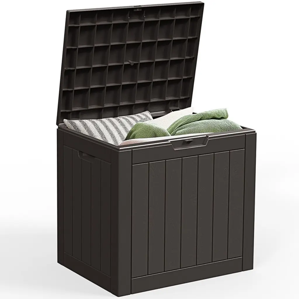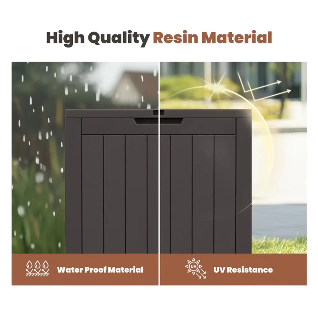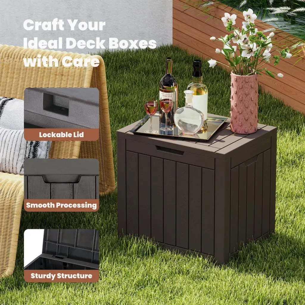 Introducing our versatile and spacious deck box designed to keep your backyard neat and organized with its generous 31- gallon capacity and dimensions of 22. 1 x17. 1 x20. 9Thisweatherproofsolutionisperfectforstoringtoolsfurniture and other outdoor items Crafted from environmentally friendly resin material it provides superior resistance to water corrosion and UV rays compared to traditional options Beyond storage this multi- purpose box can double as a seat or table supporting up to 165lb for added convenience Security is enhanced with lockable holes ensuring safe opening and closing Easy to assemble with included tools and instructions this stylish and functional deck box is an ideal addition to any outdoor space.