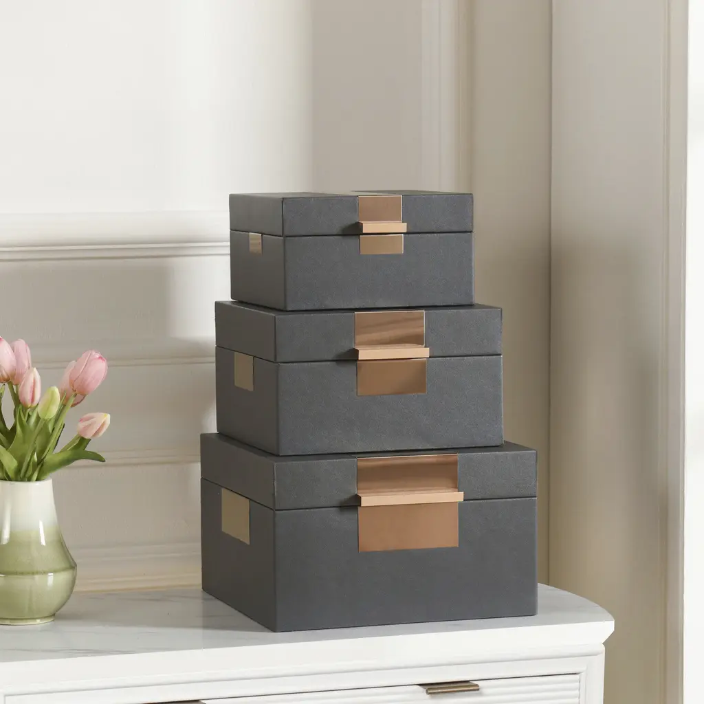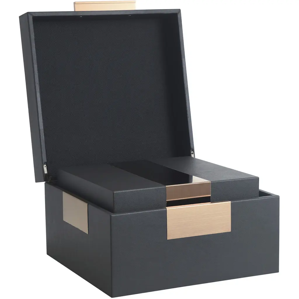 Adorn your home with our John accessory box set. Crafted meticulously with leather and metal, each piece brings a unique charm to your living space. This set can easily enhance the aesthetics of your hallway or dining room, leaning into the timeless charm of Art Deco design.