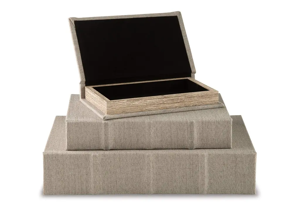 The Jolina set of three keepsake boxes makes storage so quietly understated. The beige linen cover is complemented inside with a black velvet lining. The perfect place for your dearest keepsakes, this set adds a touch of casual elegance to your decor. Weight 5.440 lbs. (2.45kgs.)