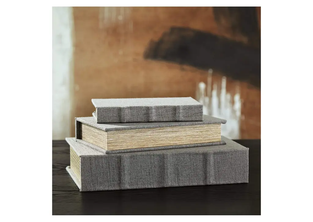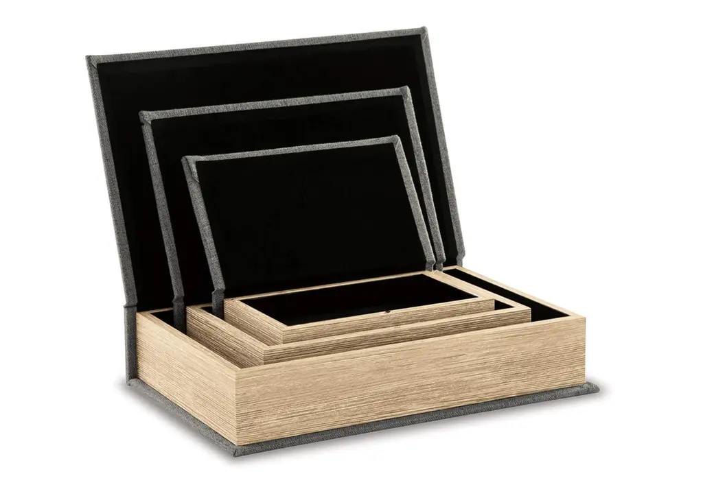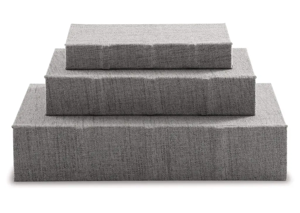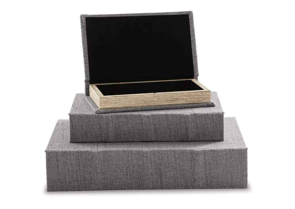 The Jolina set of three keepsake boxes makes storage so quietly understated. The gray cover is complemented inside with a black velvet lining. The perfect place for your dearest keepsakes, this set adds a touch of casual elegance to your decor. Weight 5.000 lbs. (2.25kgs.)