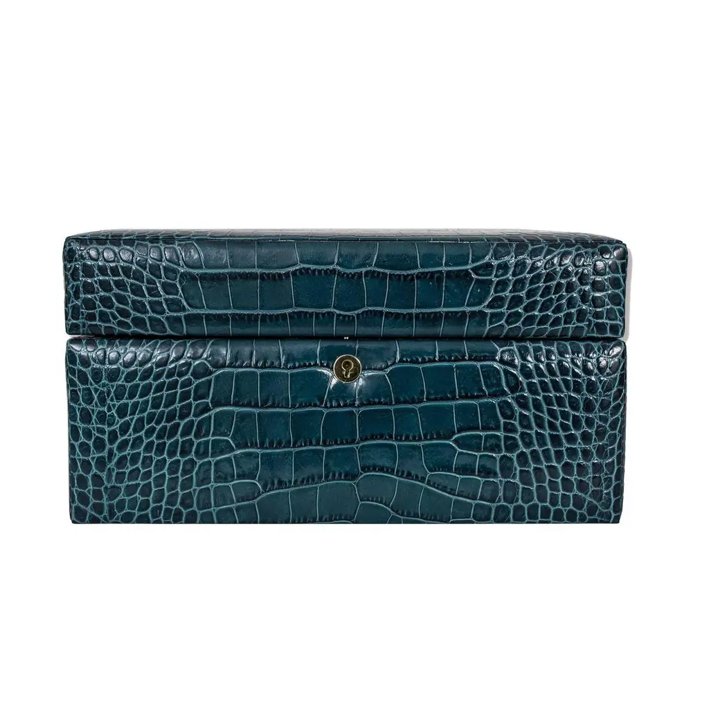 A refined gift to an elegant woman or a stunning addition to a personal collection, this jewelry box is a special piece of functional decor that stores precious items, while displaying elegance and sophistication. Its simple silhouette is upholstered by hand with fine leather that was finished with a texture that stunningly resemble crocodile skin.
