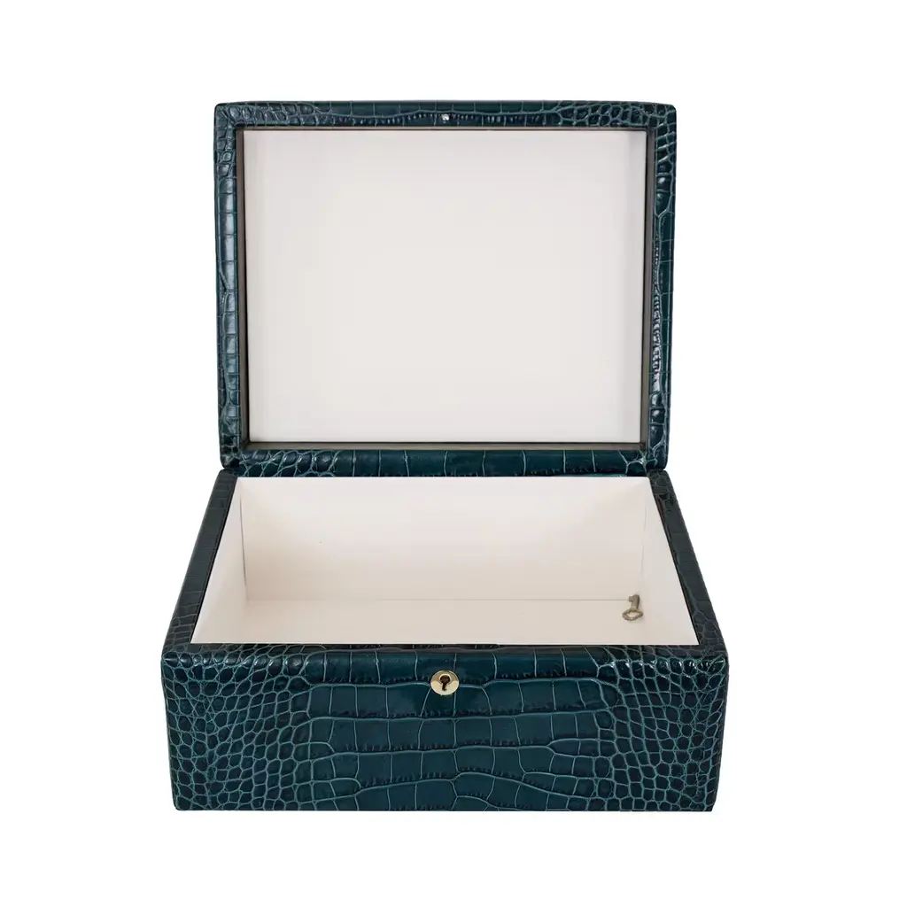 A refined gift to an elegant woman or a stunning addition to a personal collection, this jewelry box is a special piece of functional decor that stores precious items, while displaying elegance and sophistication. Its simple silhouette is upholstered by hand with fine leather that was finished with a texture that stunningly resemble crocodile skin.