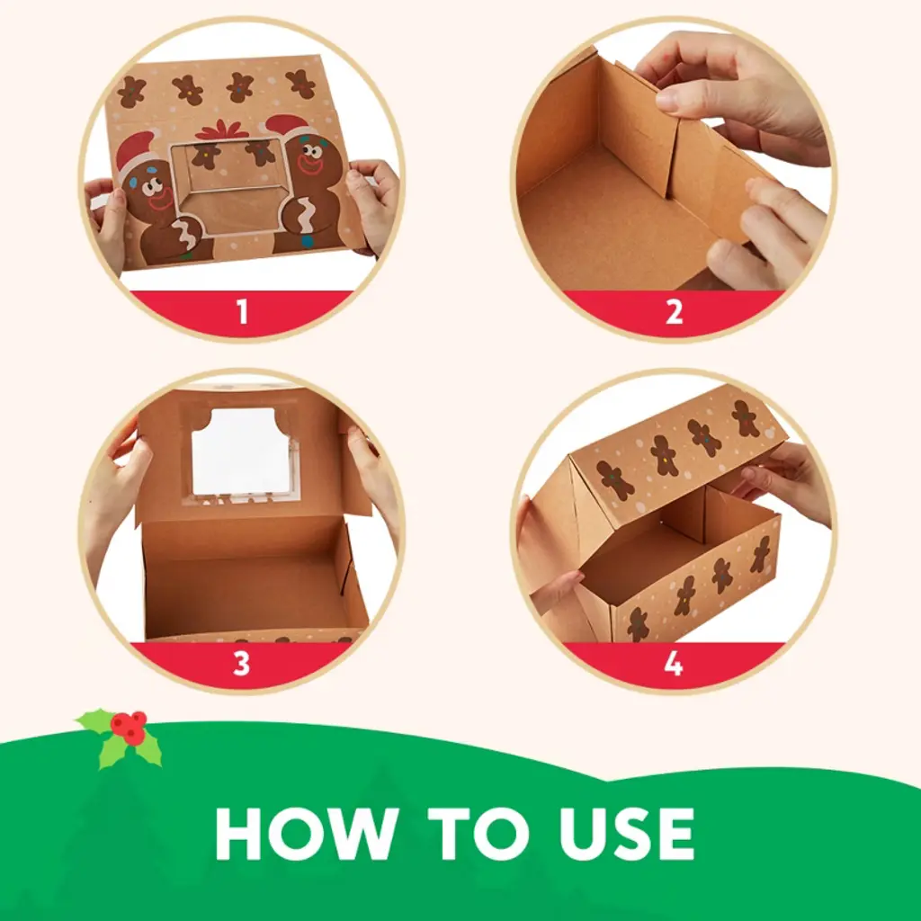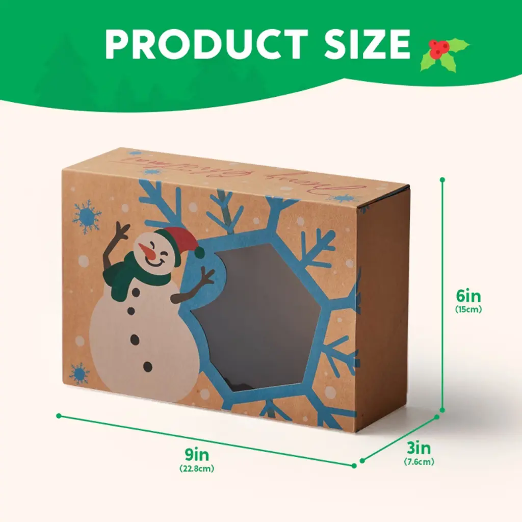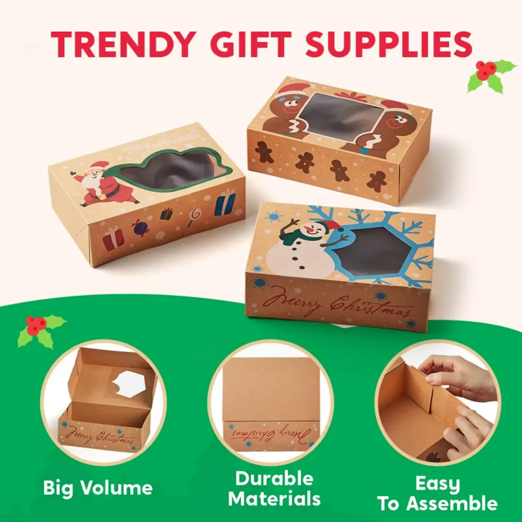 Make your baked goods the star of every holiday gathering with our 24-piece set of vintage kraft bakery boxes featuring three charming designs (Happy Santa, Playful Snowman, and Cheerful Gingerbread Man). Each spacious 8.75"x5.75"x2.75" box comes with a crystal-clear window top to beautifully display your cookies, cupcakes, brownies, and other sweet treats. ✔ Instant Holiday Cheer – Adorable designs that spread seasonal joy ✔ Premium Protection – Made from extra-durable kraft paperboard with biodegradable window film ✔ Effortless Assembly – Auto-popup design saves precious holiday prep time ✔ Versatile Gifting – Perfect for holiday parties, bakeries, gourmet treats, and last-minute gifts ✔ Eco-Friendly Packaging – Sturdy yet planet-conscious materials. Ideal for home bakers, small businesses, and holiday hosts, these boxes turn ordinary treats into extraordinary edible gifts. The perfect blend of nostalgia and functionality.