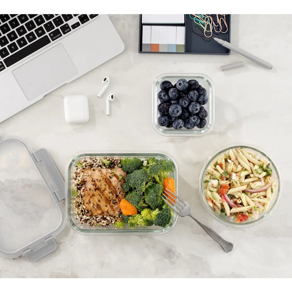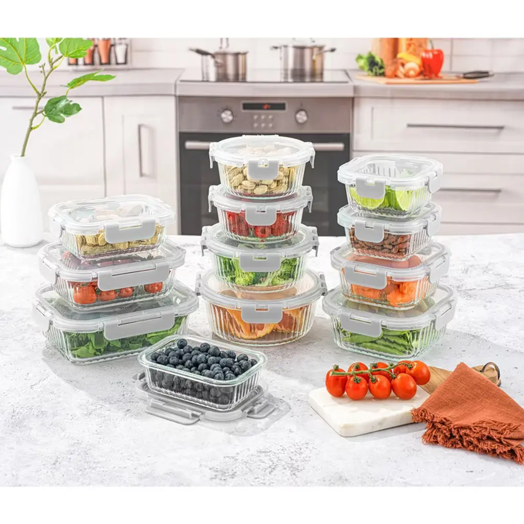 Fluted Food Storage Containers for Pantry, Fridge or Freezer Storage, from JoyFul by JoyJolt. Set of 12 glass containers for food storage with lids. Includes: Four Rectangle Containers 35oz (8x6in), 21oz (6.75x5in), 12oz (two 4.2x5.5in). 4 Square Containers 27oz (6in), 17.5oz (5.2in), 11oz (two 4.3in). 4 Round Containers 32oz (6.75in). 21oz (5.9in), 13.5oz (two 5.2in). Heights range from 1.75-2.3 inches. Each one comes with an airtight lid for fresh food and leakproof lunches! Temperatures: Made from Borosilicate Glass this kitchen containers set can withstand up to 1040DegF in the oven, Microwave Safe, and Dishwasher Safe (not the lids). Fridge Safe and Freezer Safe to minus 104Deg WITH Lids. And the best part is you get large tupperware, small containers, round, rectangle and square glass containers with lids to fit your shaped food! What a great idea! Cook for Joy, JoyFul by JoyJolt.