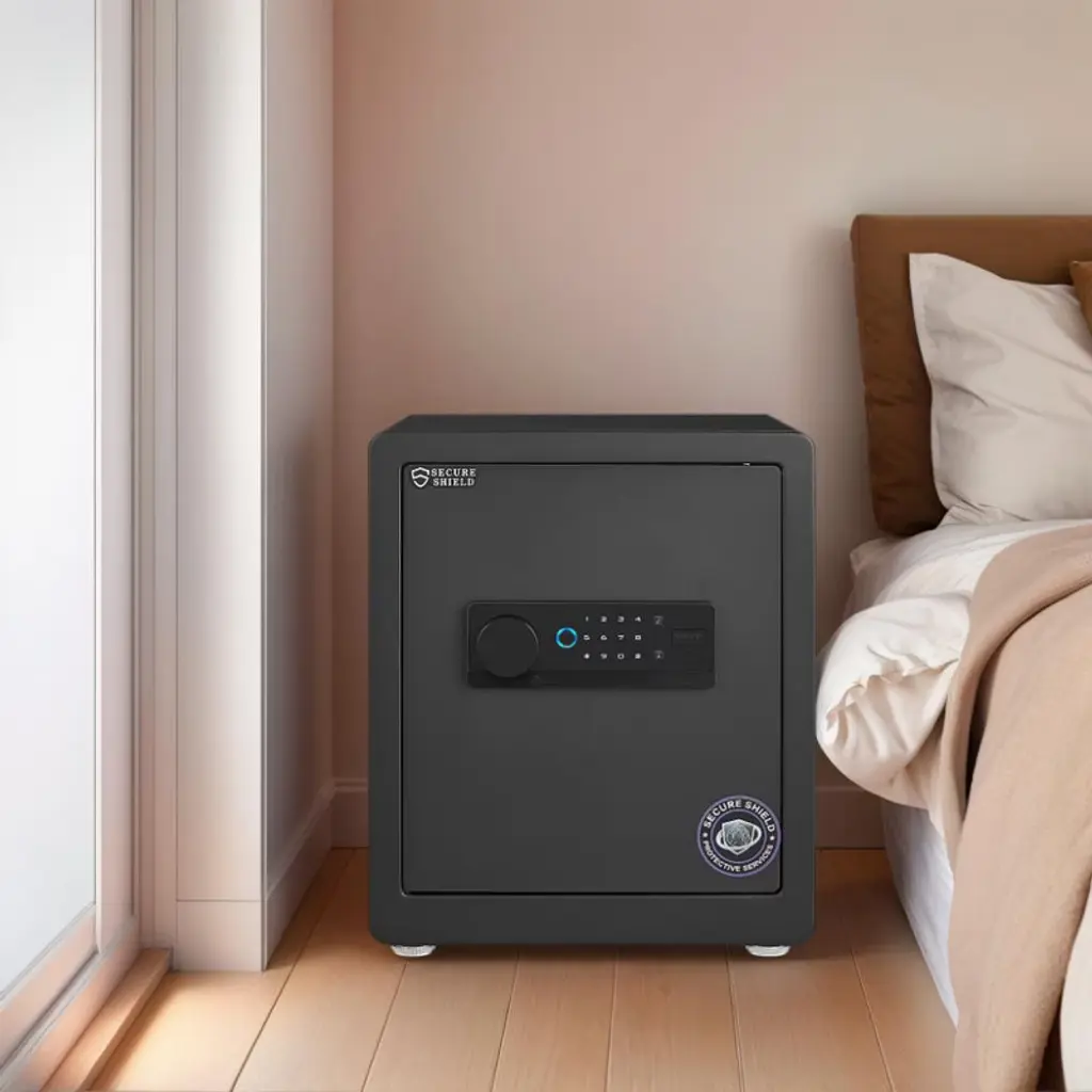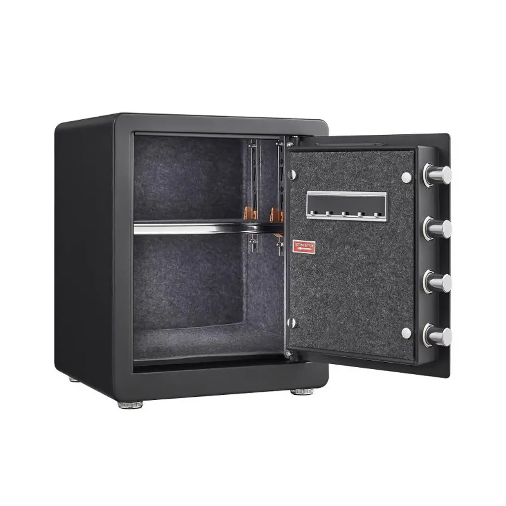 This large home security safe offers extra-spacious interior storage, perfect for safeguarding valuables like documents, jewelry, cash, medicines, and more. Crafted from solid cold-rolled steel with an integrally welded, pry-resistant door and scratch-resistant powder coating, it ensures long-lasting durability and rust protection. Equipped with a multi-functional locking system—including fingerprint recognition, programmable electronic keypad, backup keys, and dual verification (fingerprint + password/key)—it balances security and convenience, while the ergonomic sloped keypad design reduces cervical strain. Inside, a removable shelf and built-in felt pad keep items organized and scratch-free, with an LED light for easy access in low light; the cabinet door features hooks for lightweight items like necklaces, and a concealed bottom compartment adds extra storage. Pre-drilled holes and mounting hardware make it easy to secure to floors or walls, making it ideal for home, office, or any space needing reliable protection.