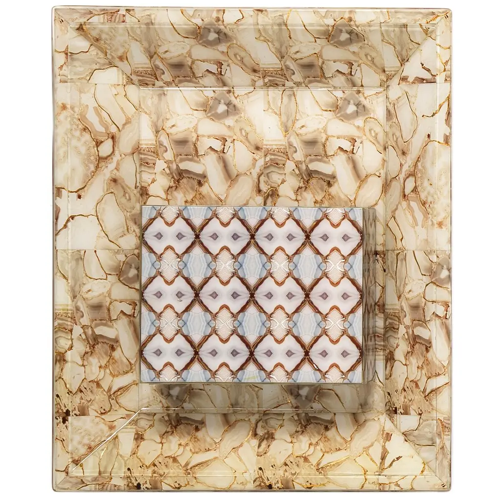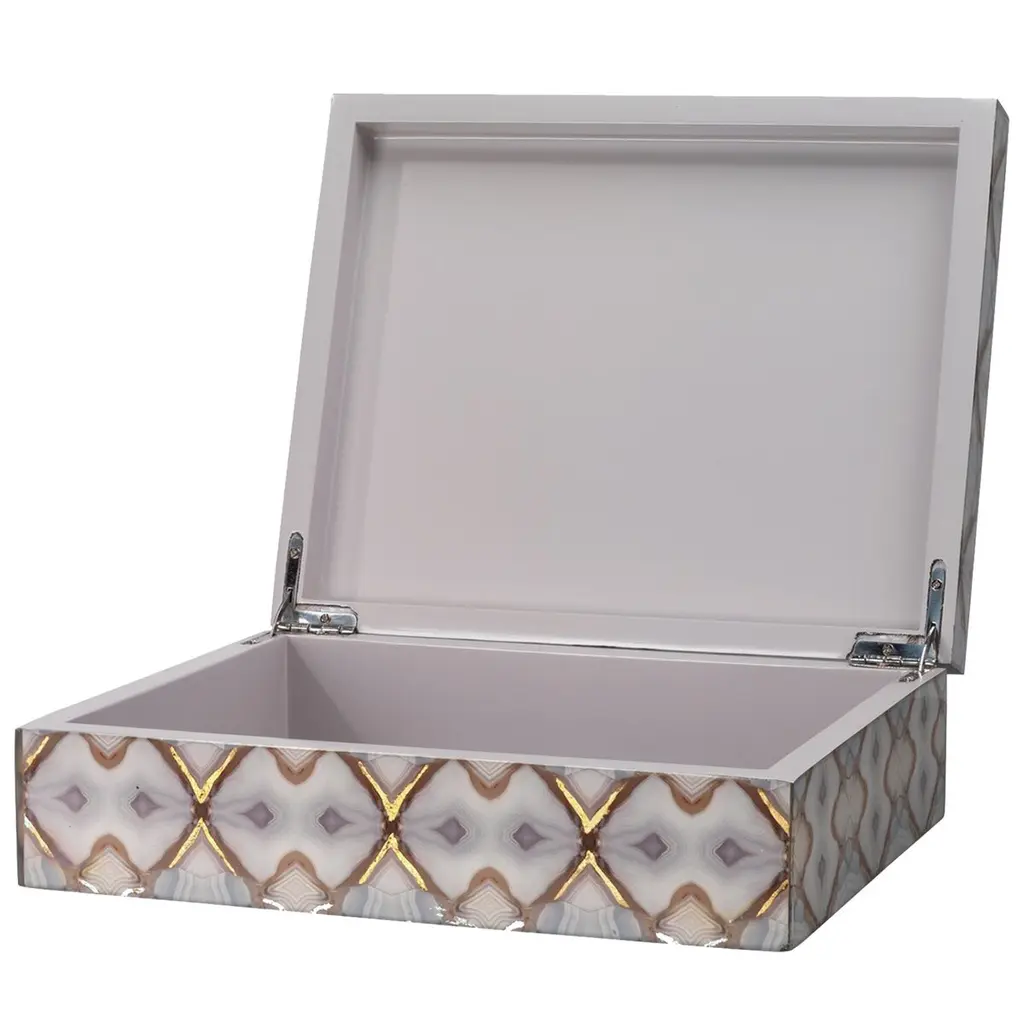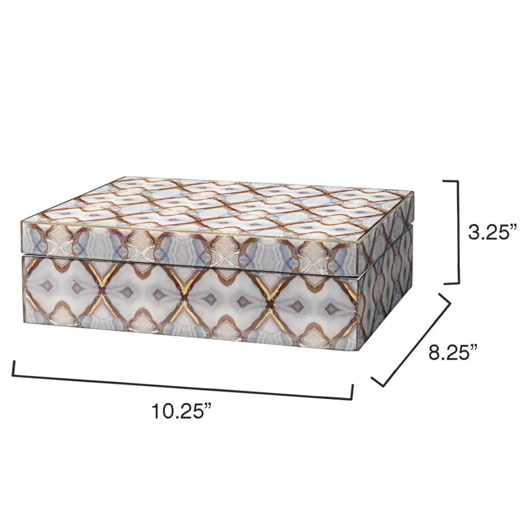 The design of this box is inspired by photos of agate, arranged to evoke the mesmerizing effect of looking through a kaleidoscope. Hand-applied gold leafing enhances the pattern, adding a layer of sophistication and creating a stunning finish. Perfect as a catchall for small items like jewelry or sunglasses, this box combines artistic flair with practical elegance.