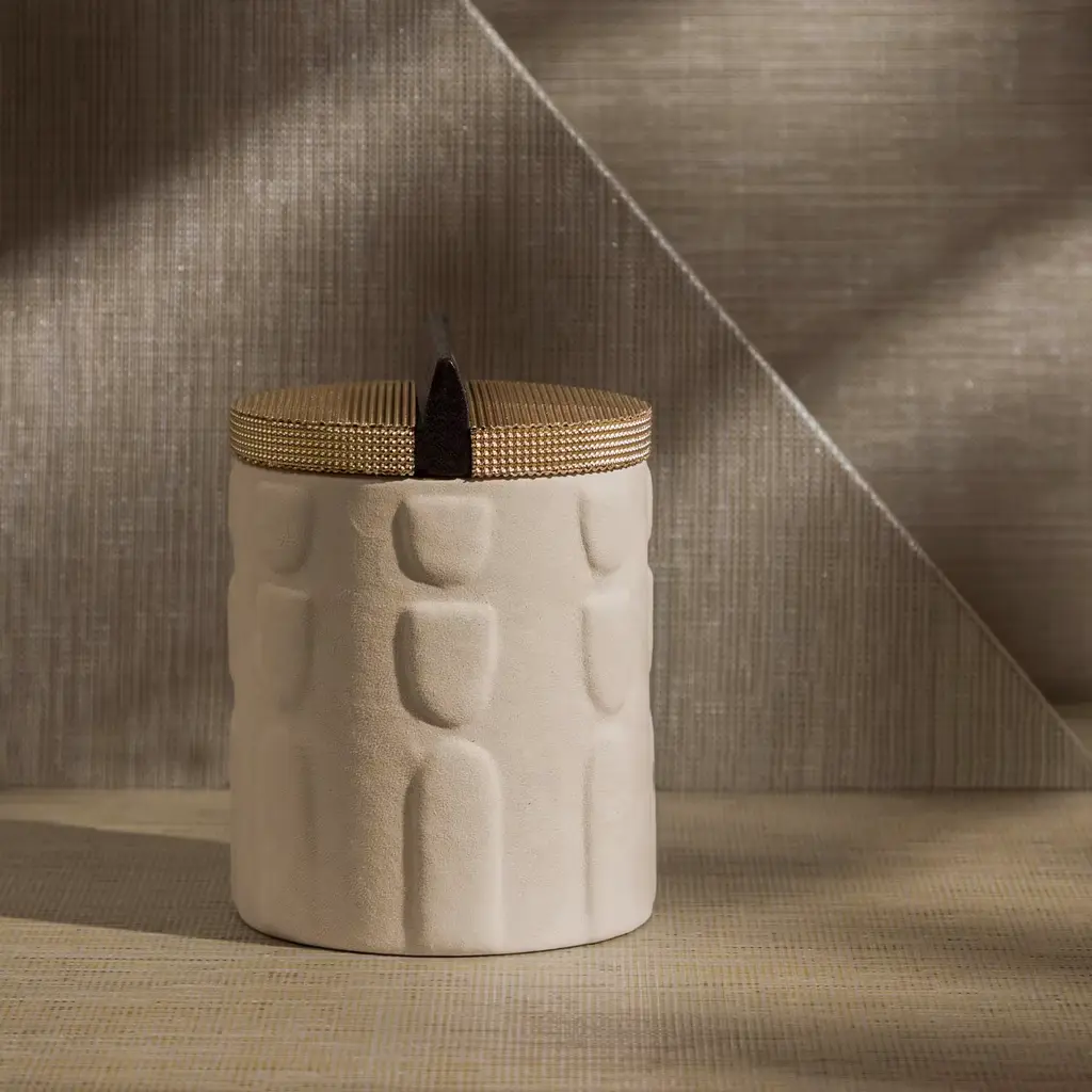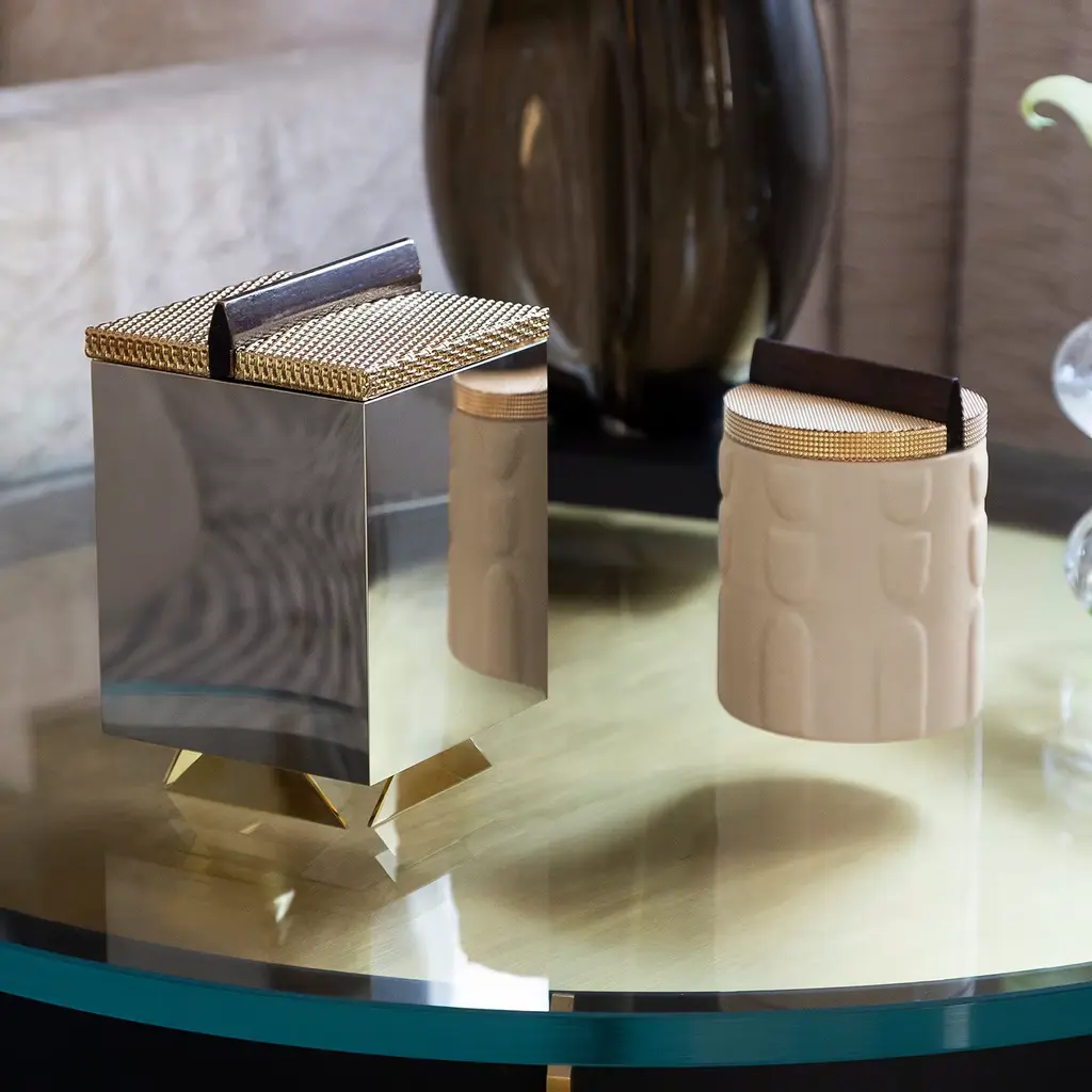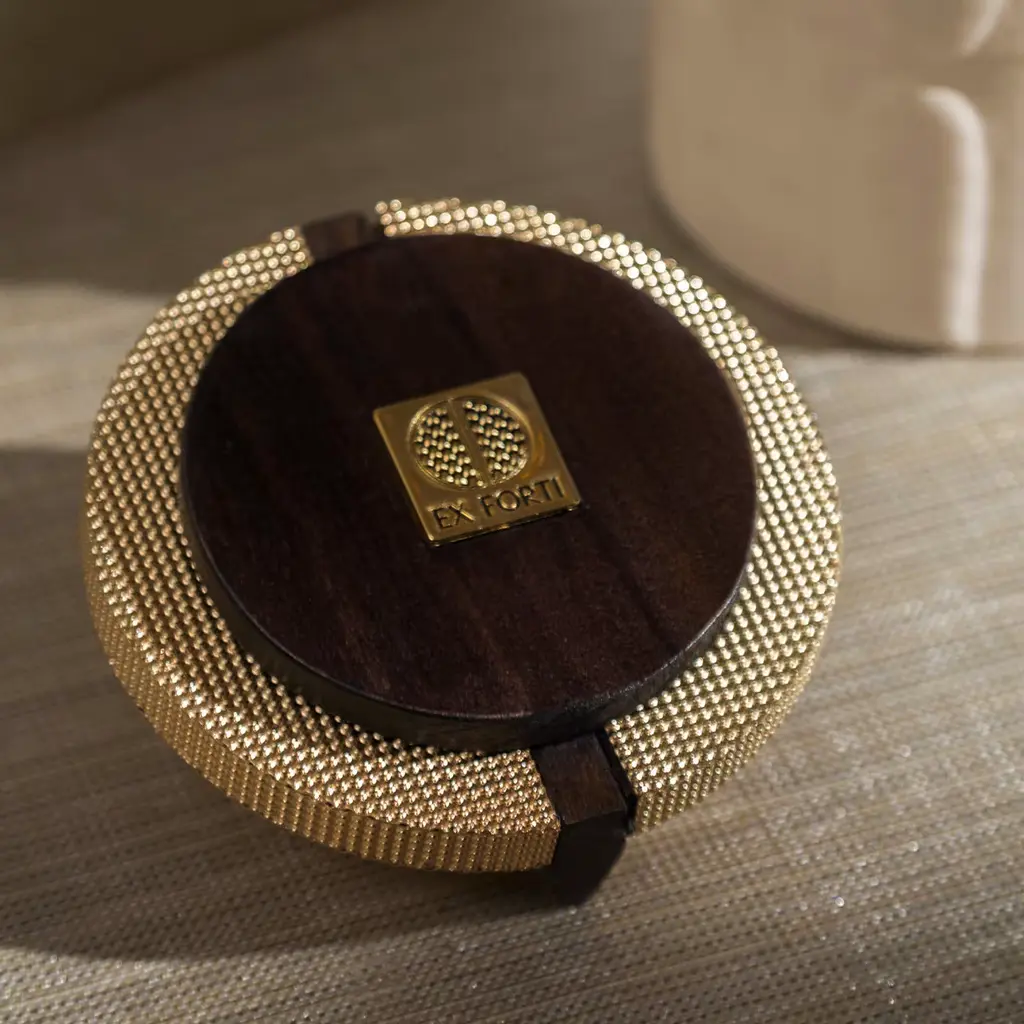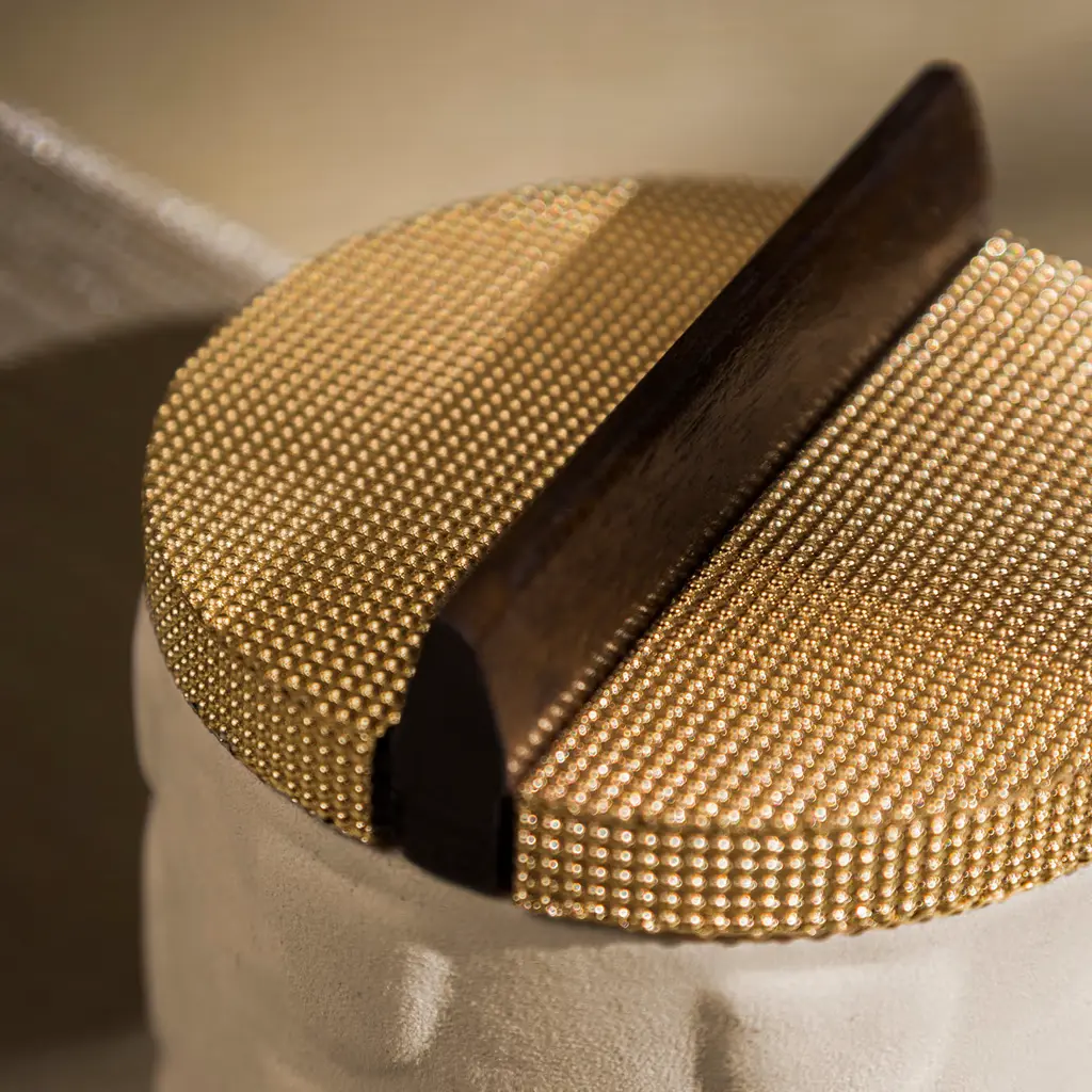 A clever synthesis of sculpture and architecture exemplified by an artisan box that is as tiny as it is precious. A raised pattern recalling pre-Columbian subjects adds textural dynamism to the cylindrical Canaletto walnut frame, upholstered in beige Nubuck leather for a superb tactile feel. The brass lid offers a superb sheen from the highly reflective links comprising the mesh design, only interrupted by the linear wooden knob whose rigor is a tribute to Rationalist lines.