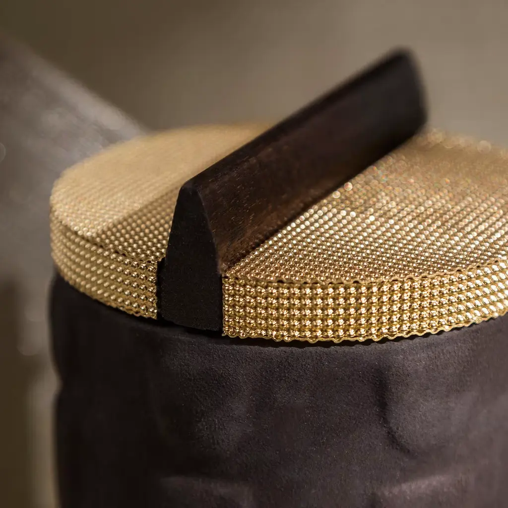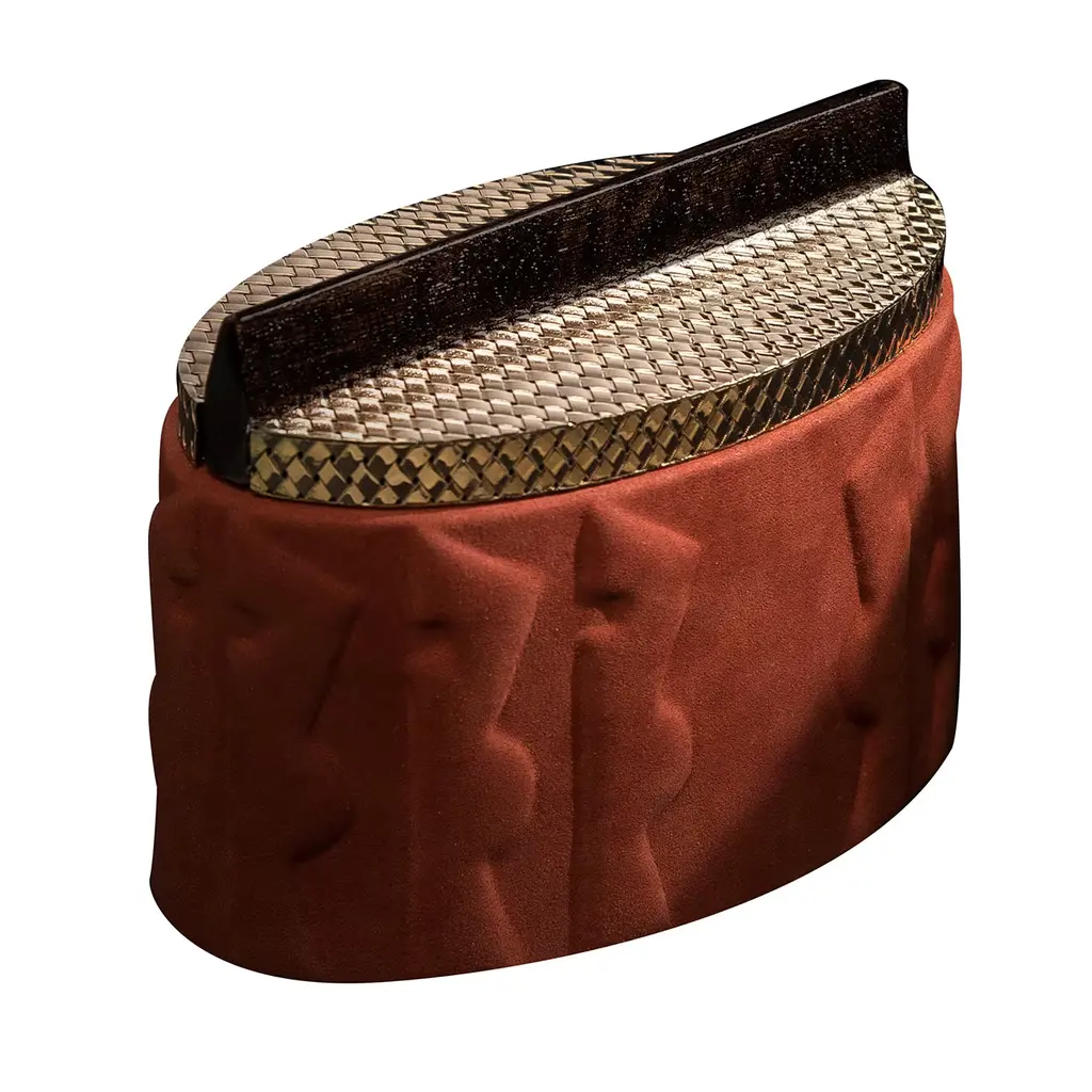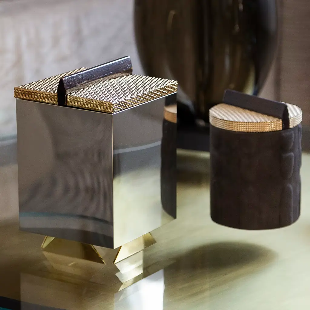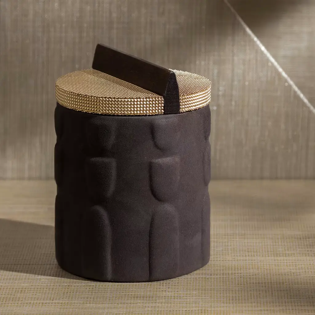 Covered in prized, black-hued Nubuck leather for an exquisite tailored feel, this bold, handcrafted box from the Bacabs Collection is a fine synthesis of architectural and artistic references. The cylindrical body in solid Canaletto walnut boasts a soft, raised pattern of silhouettes borrowed from pre-Columbian art, while the linear wooden handle equipping the mesh-like, brass-finished lid evokes the rigorous neatness of Rationalist lines. Available in different colors upon request.
