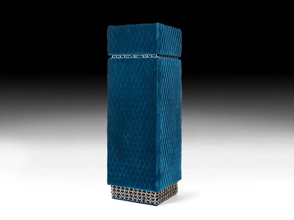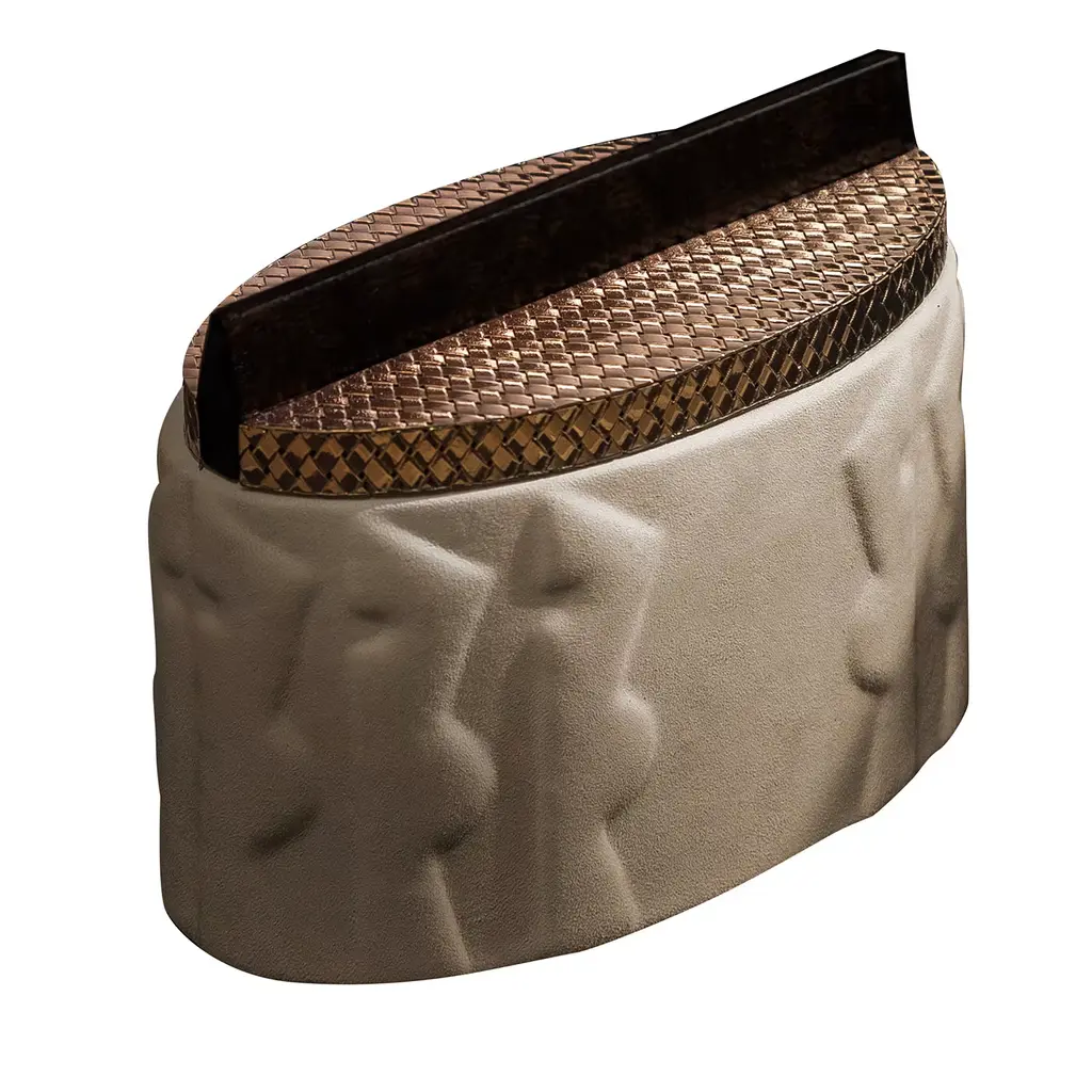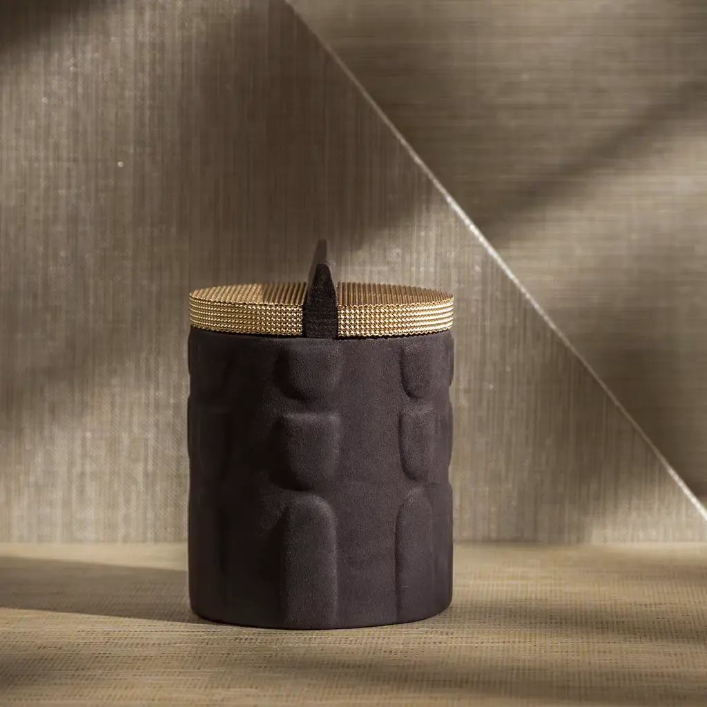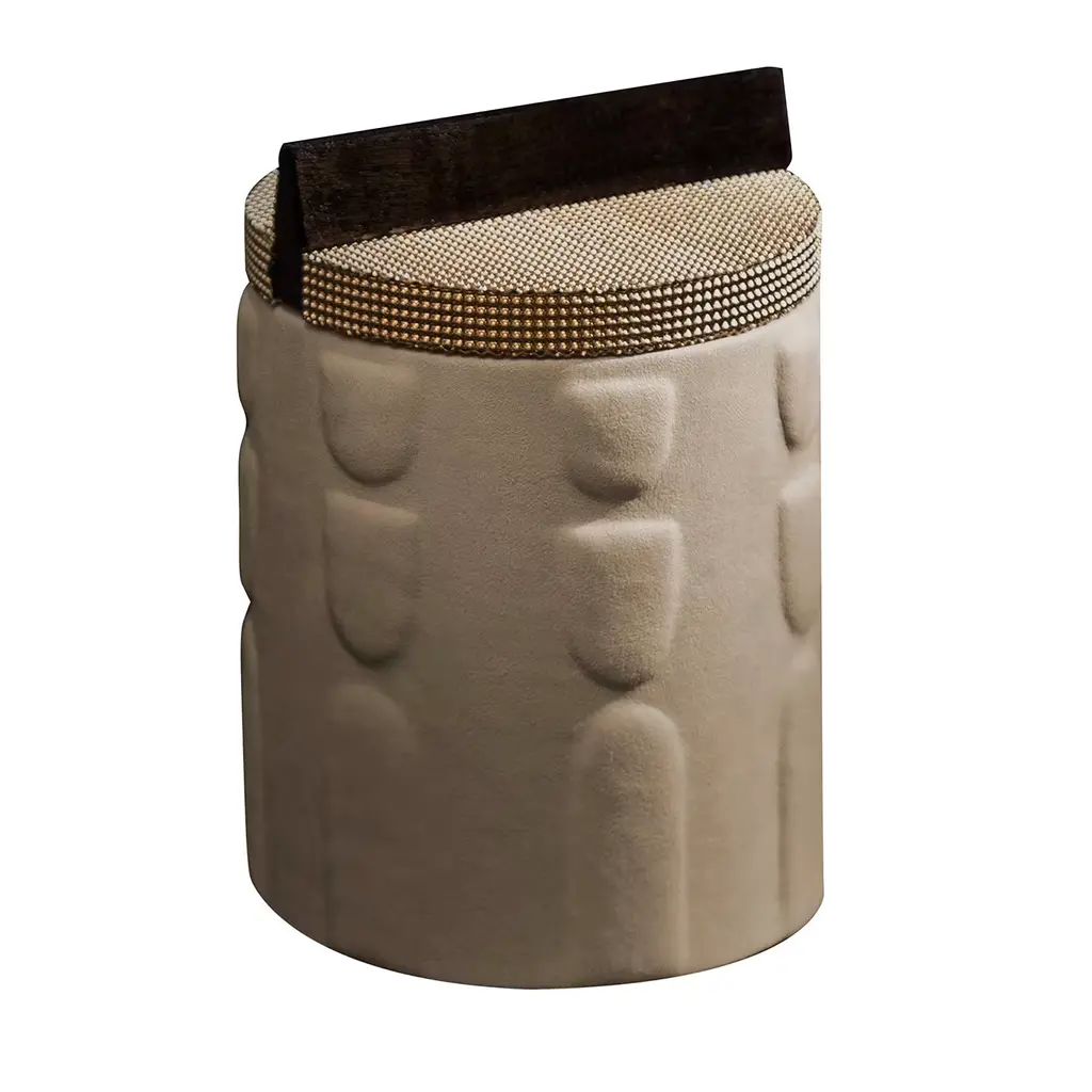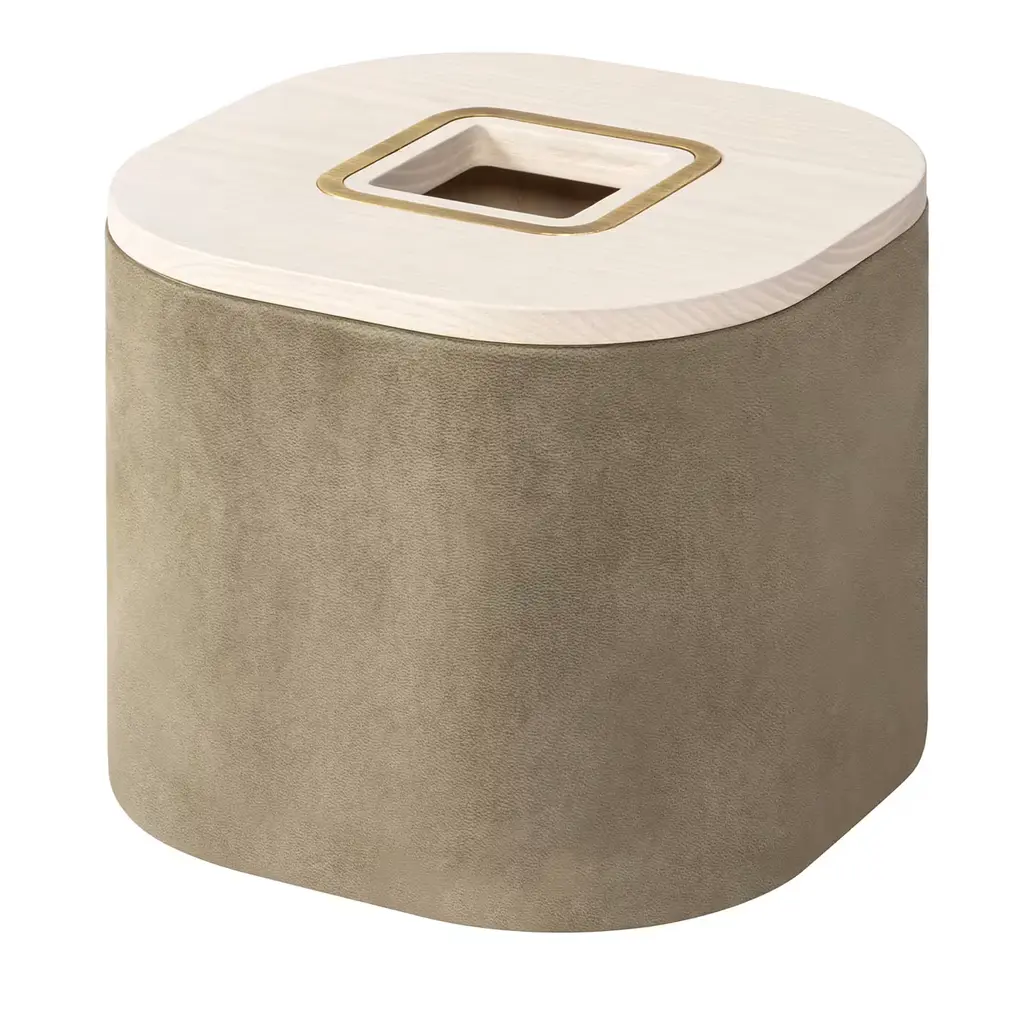 Covered in prized, black-hued Nubuck leather for an exquisite tailored feel, this bold, handcrafted box from the Bacabs Collection is a fine synthesis of architectural and artistic references. The cylindrical body in solid Canaletto walnut boasts a soft, raised pattern of silhouettes borrowed from pre-Columbian art, while the linear wooden handle equipping the mesh-like, brass-finished lid evokes the rigorous neatness of Rationalist lines. Available in different colors upon request.