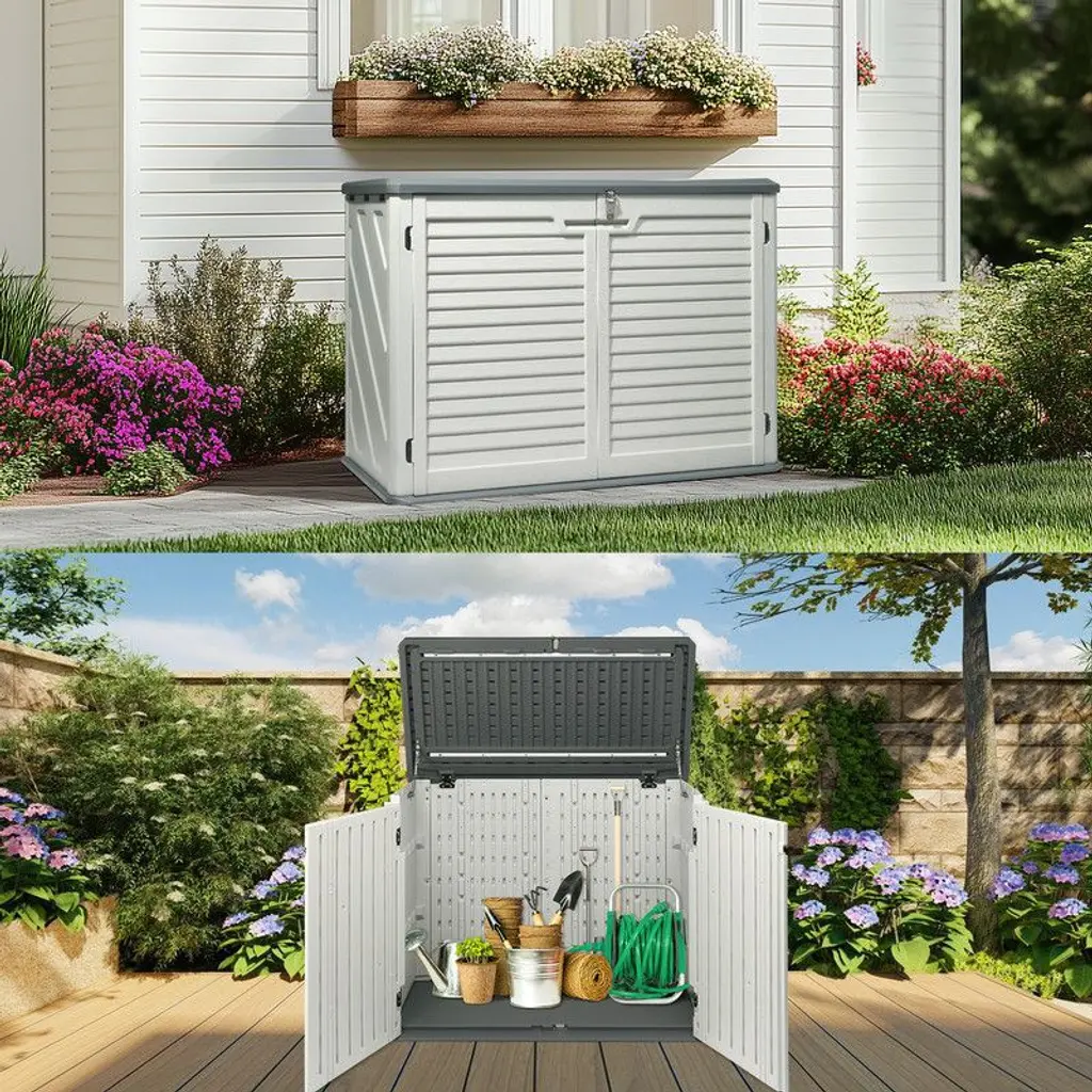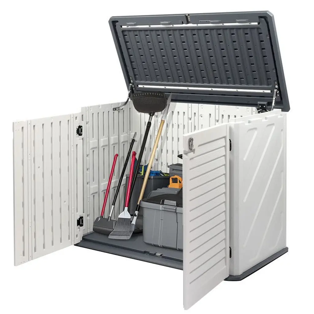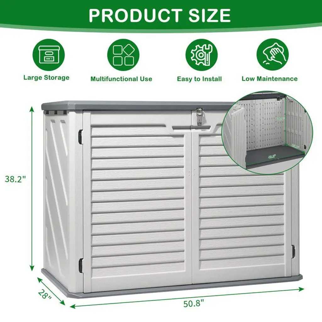 The Resin Outdoor Storage Shed provides accessible storage for your backyard, garden, or poolside. With its large storage capacity, this shed boasts a spacious interior that can hold trash cans, or a wide array of patio accessories, pool equipment or garden tools. With its sloped threshold, even your push lawnmower can be easily rolled in or out for convenient weatherproof storage.