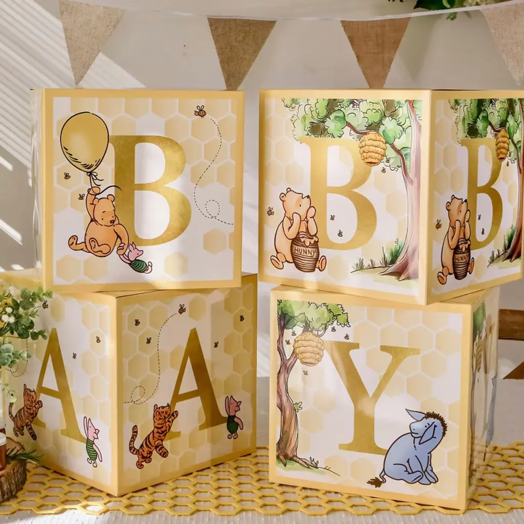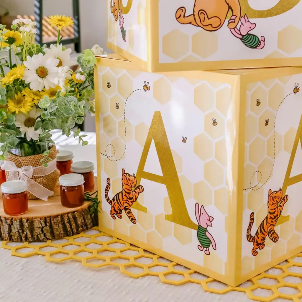 Bring the classic theme to your baby shower with our Honey Bear Baby Block Boxes. These four stacking boxes will add whimsy and nostalgia to your baby's celebrations. Each one is adorned with our favorite characters hanging around the classic B-A-B-Y letters bringing all the joy right back from our childhood. With the cheerful yellow palate and honeycomb design, our baby block boxes are great for every baby shower no matter the gender; they are perfect for gender reveal parties and great for documenting your baby's growth through the months. Our Honey Bear Baby Block Boxes are a great way to designate your gift table, draw attention to the mother-to-be's throne, and later to use as props in a baby photo shoot. There are so many ways to use them and so many celebrations that call for them. That is why they are easy to assemble and easy to fold up and conveniently can be stored away for the many times you will be using them.