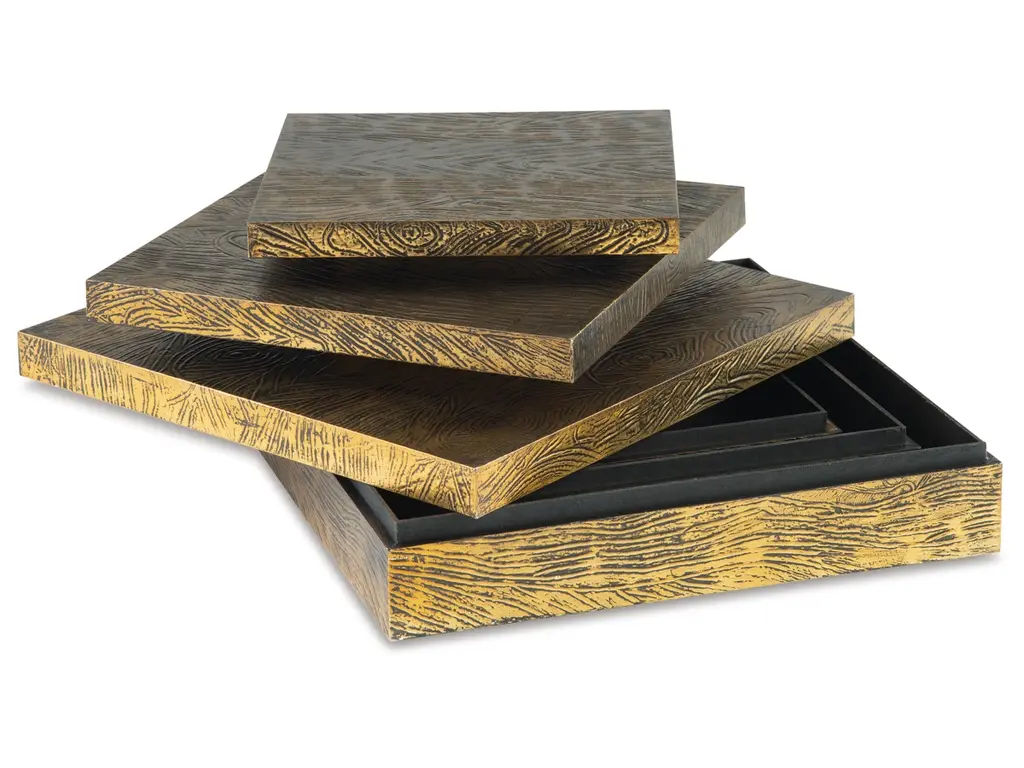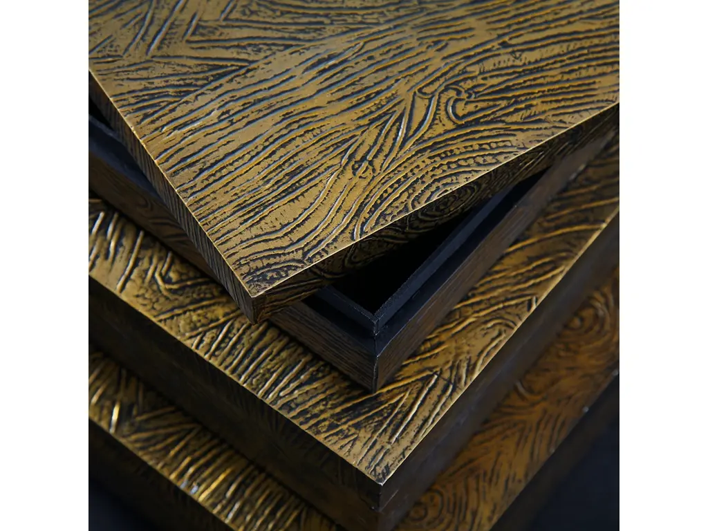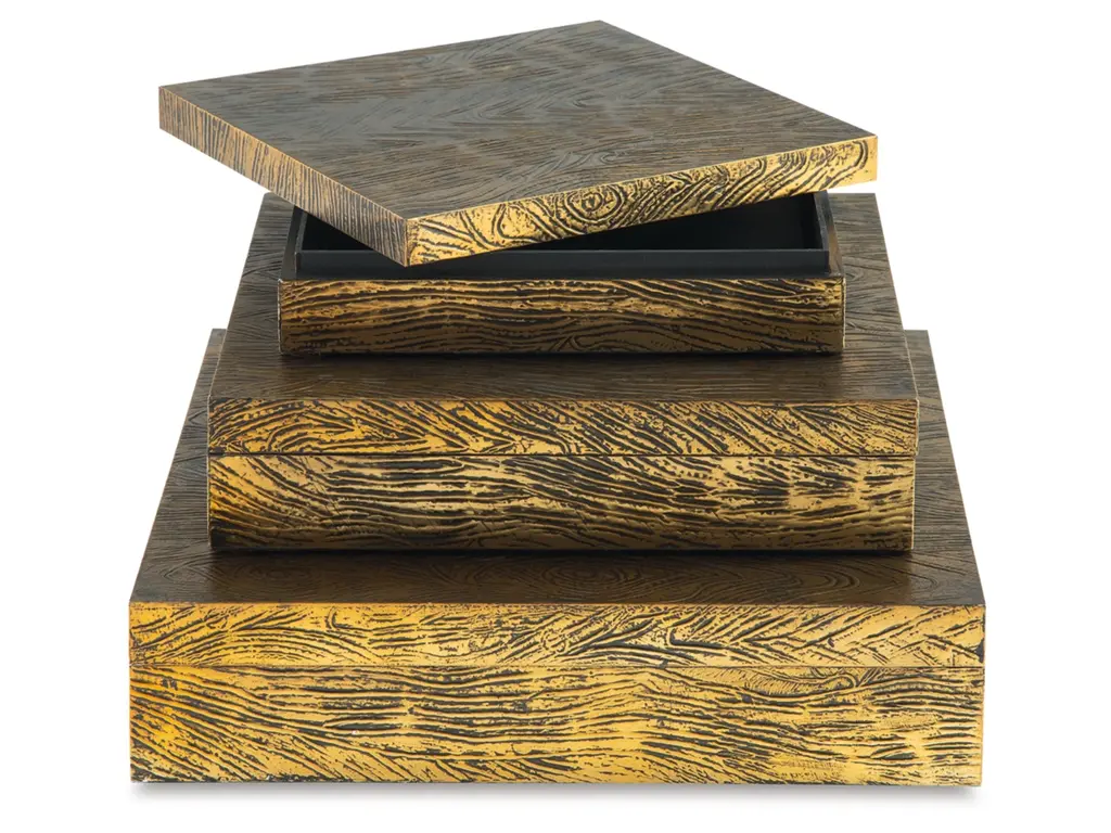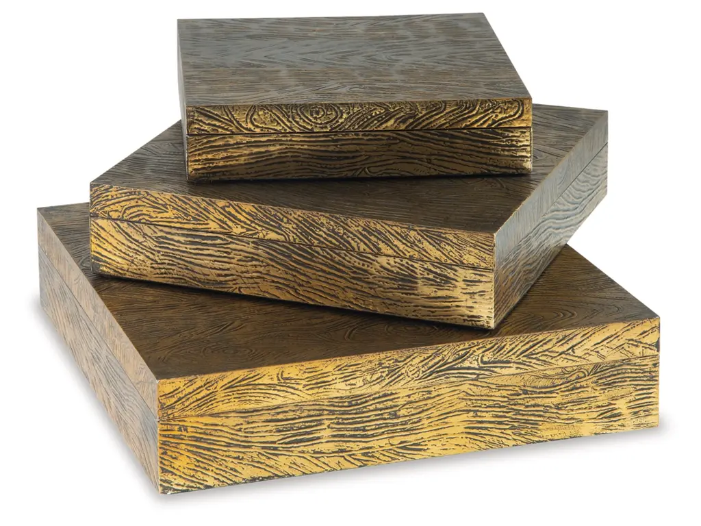 Ideal for a dresser, chest or accent table, the Keldy set of three wood and metal boxes is a contemporary choice for the forward-thinking modernist. The antiqued brass-tone finish is an inspired touch.