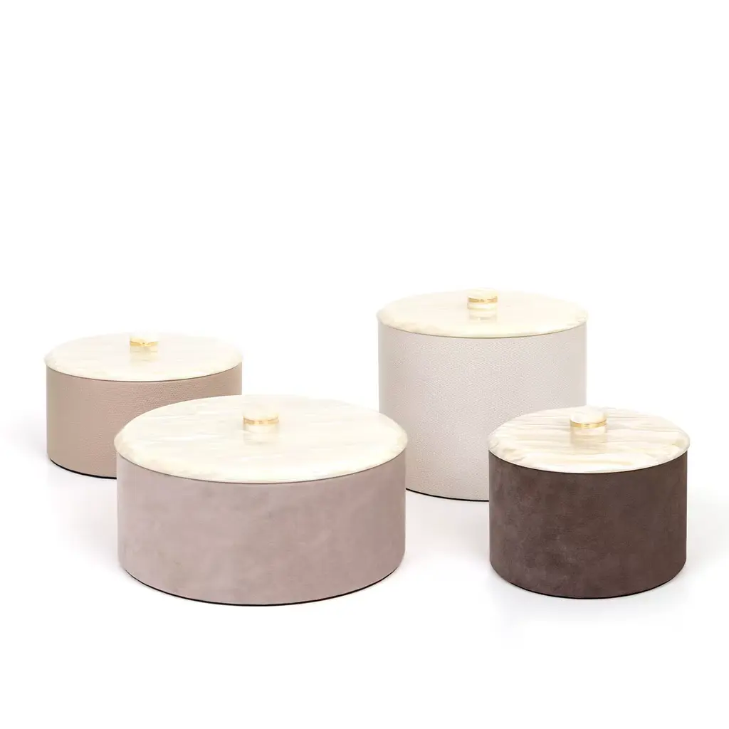 Utterly luminous in its combination of fine light-beige leather and nacre-effect resin lid, this cylindrical box makes for a sublime piece where to gather make-up favorites or jewelry essentials. The rigor of its geometric design gets here cleverly counterbalanced by the indulgence in precious finishes. Different versions and sizes are available in the Artemest catalog.