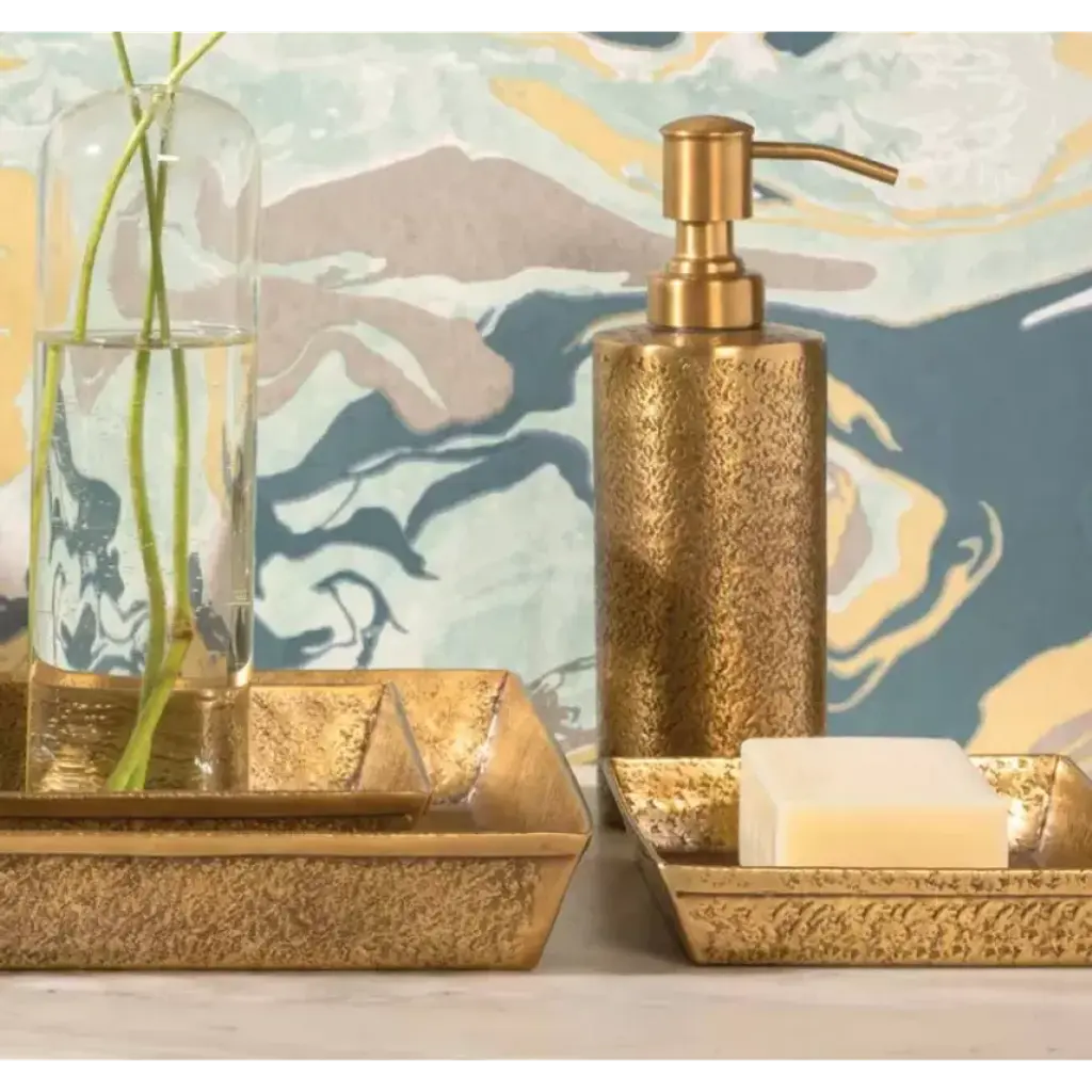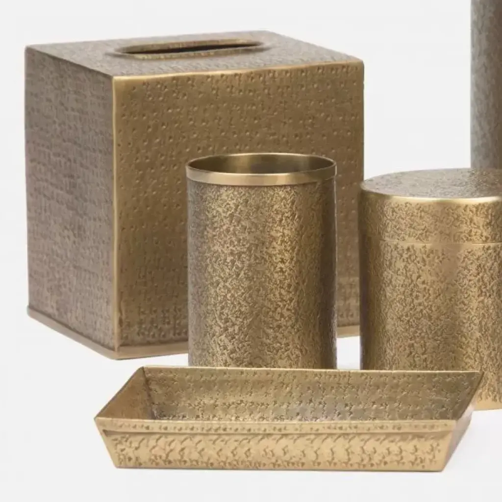Pitted brass bath collection. The designers at Pigeon & Poodle believe the details of a home are just as important as the furniture. A gorgeous toothbrush holder or handcrafted canister can elevate an entire bath, the perfect frame can heighten the feel of a whole space, and a good-looking storage basket can be your look’s missing link. With thoughtful design and top-notch craftsmanship, Pigeon & Poodle create home accessories with the care and attention typically reserved for larger pieces of décor.