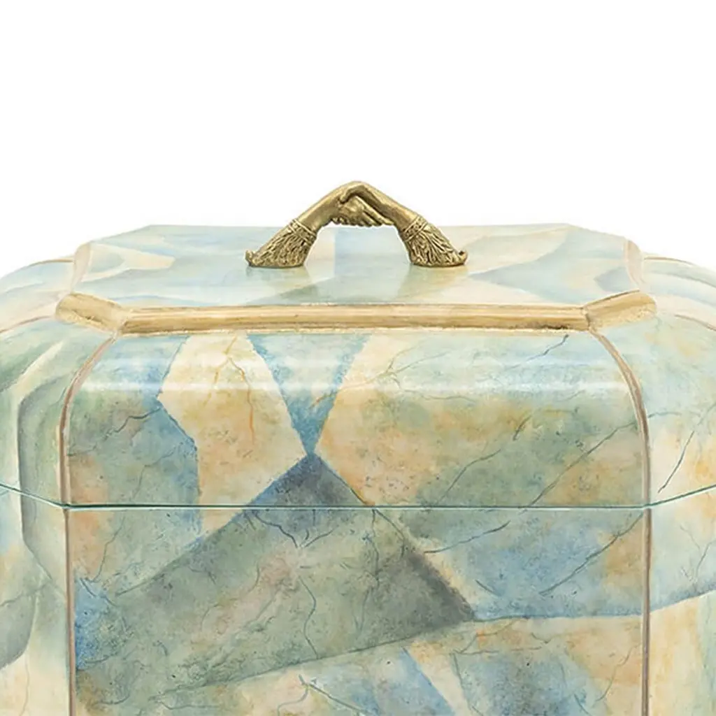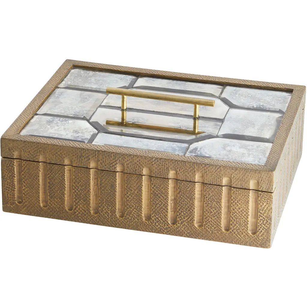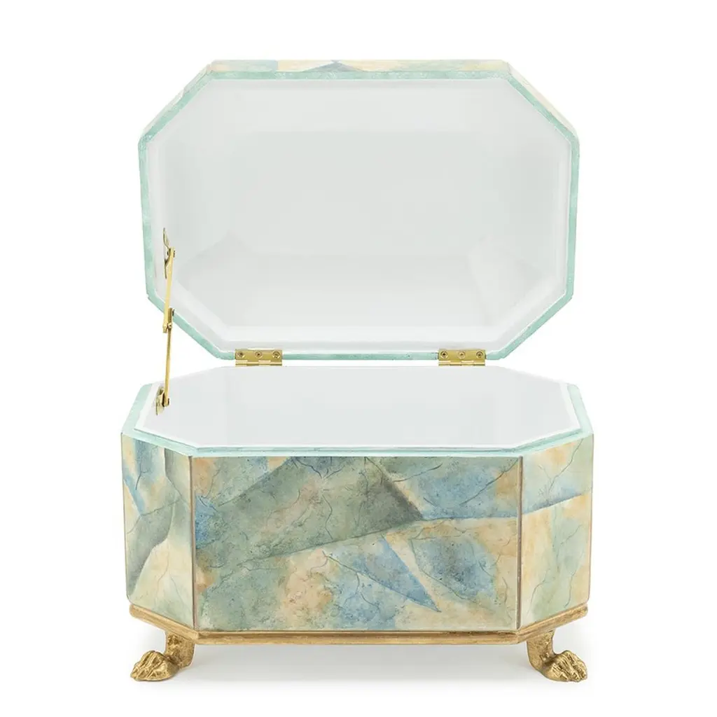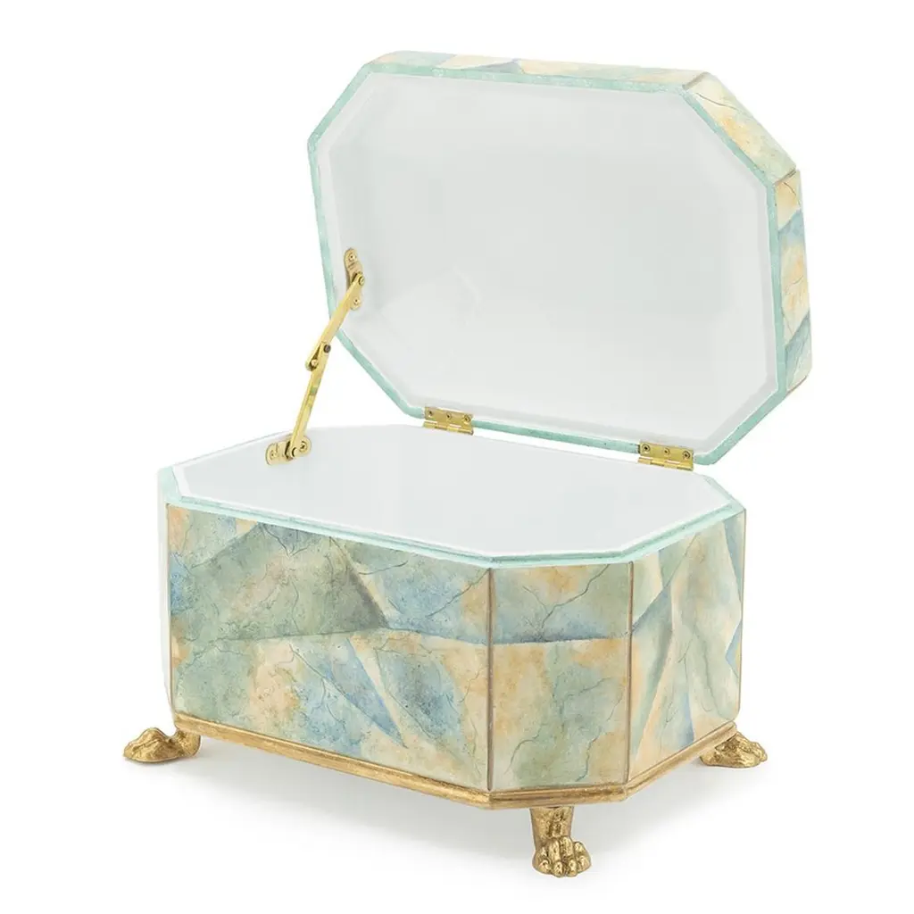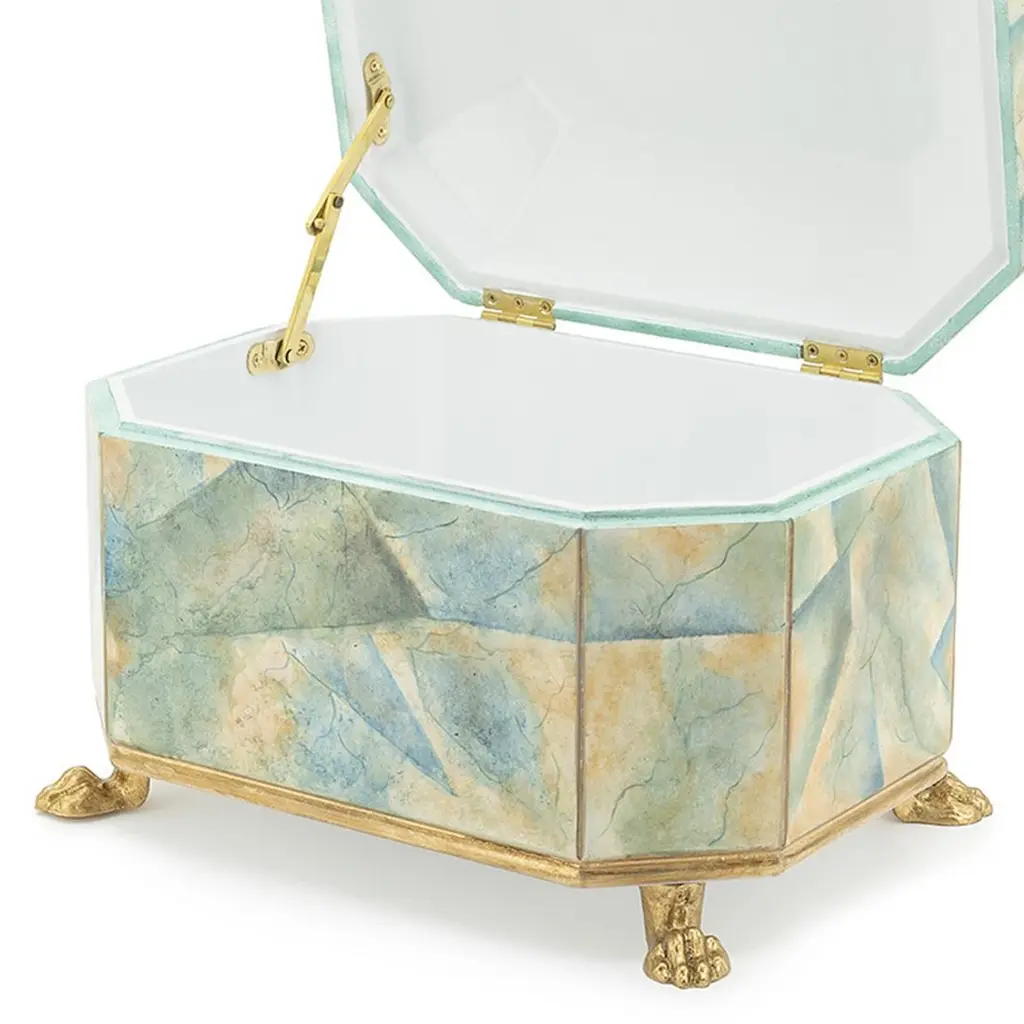 Box Kenza all in solid wood with painted pattern finish outside. With white lacqueredfinish inside, box with opening lid. With brassDeco on the top and brass feet.