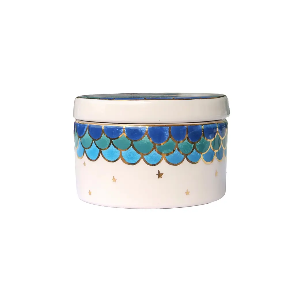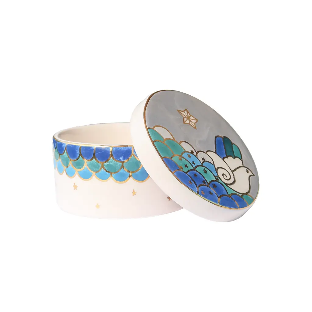 Symbolic and soulful, the Khamsa Bird Storage Box is a meaningful addition to any space. Expertly handcrafted from ceramic and adorned with hand-painted details, it showcases the Khamsa (Hand of Fatima)—a symbol of protection and good fortune—alongside a delicate bird motif that represents peace and freedom.This compact box is perfect for storing jewelry, prayer beads, or cherished keepsakes, offering both utility and spiritual charm in one beautiful piece. A thoughtful gift for those who appreciate cultural artistry and mindful living.